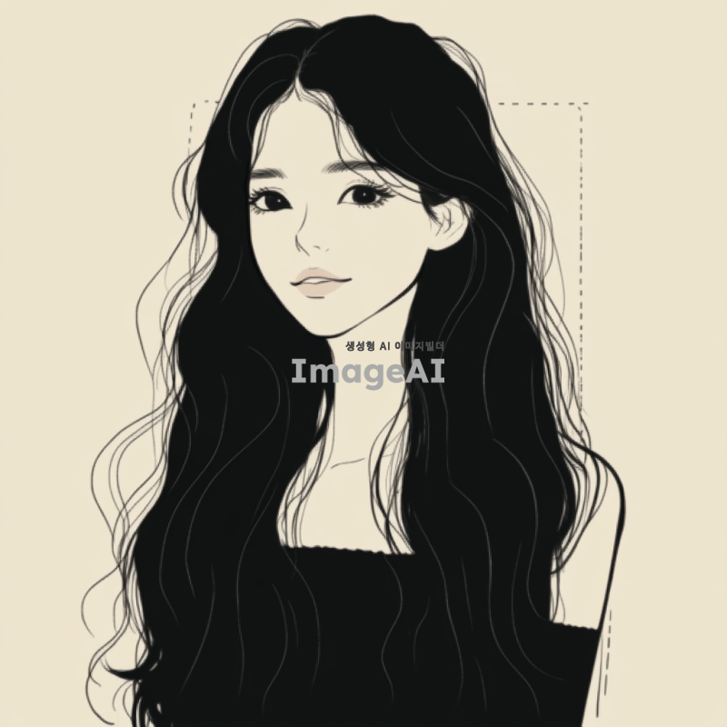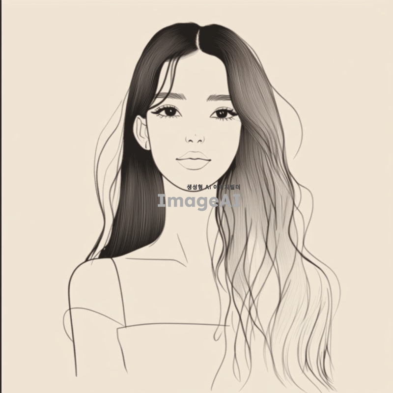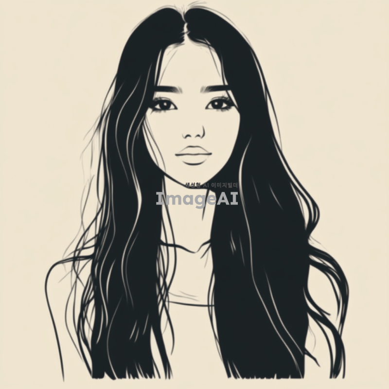 긴 머리를 가진 여자 일러스트, 채색이 안되어 있고 선으로만 그려져 있는 일러스트, 얼굴 표정은 세세히 묘사를 안되어 있는 일러스트, 아이콘처럼 단순하게 그려져 있는 일러스트, 귀와 어깨는 무조건 그려져 있어야 함.