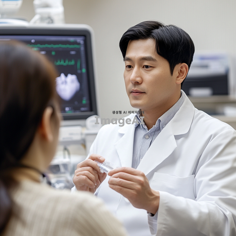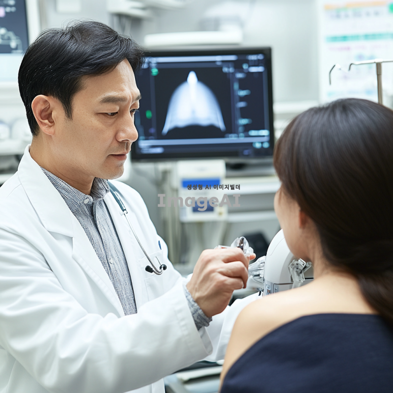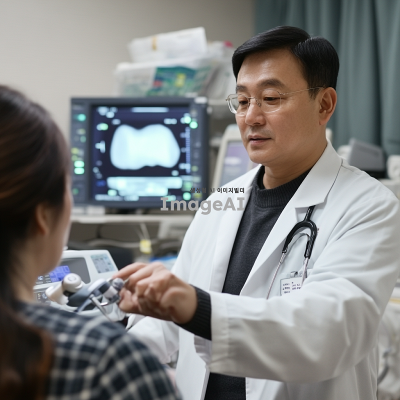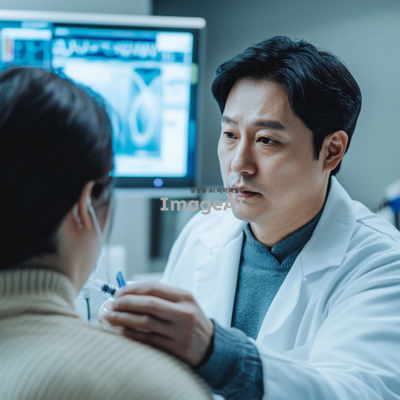 흰가운을 입은 한국인 의사가 환자의 어깨를 치료하는 모습. 환자는 모니터를 주의 깊게 바라보고 있으며, 의사는 초음파 프로브를 환자의 어깨에 대고 있다. 의사의 손에는 주사기가 들려 있고, 진지한 표정으로 모니터를 관찰하고 있다. 병원 환경이 배경으로 보이고, 전문적인 분위기가 느껴진다.
