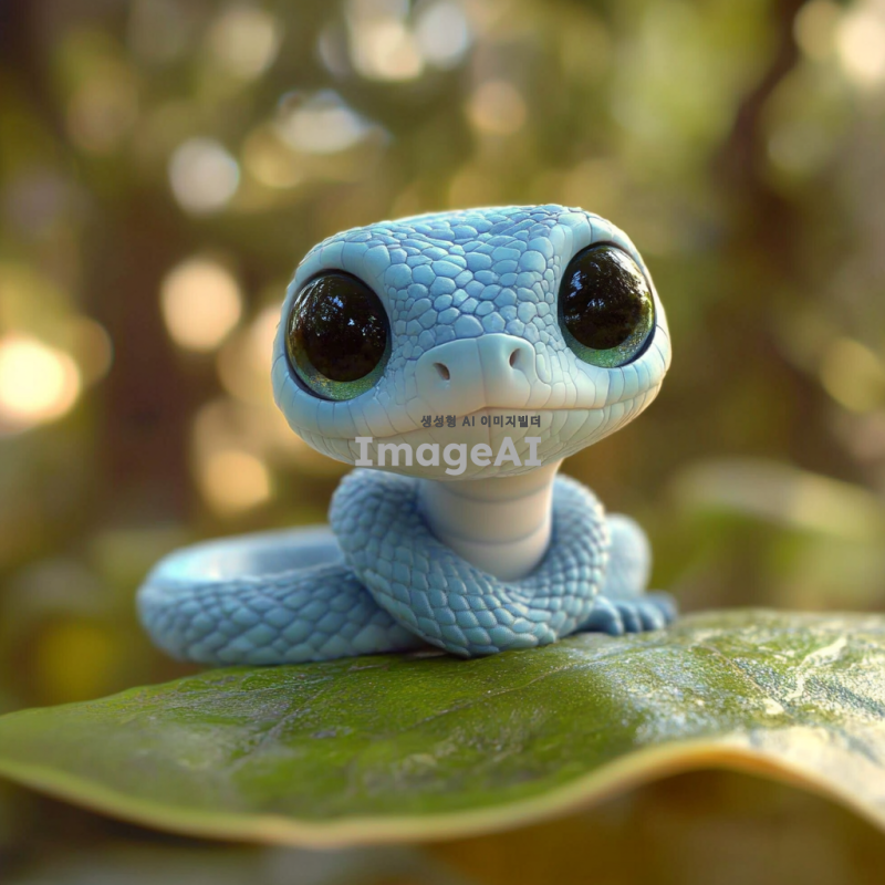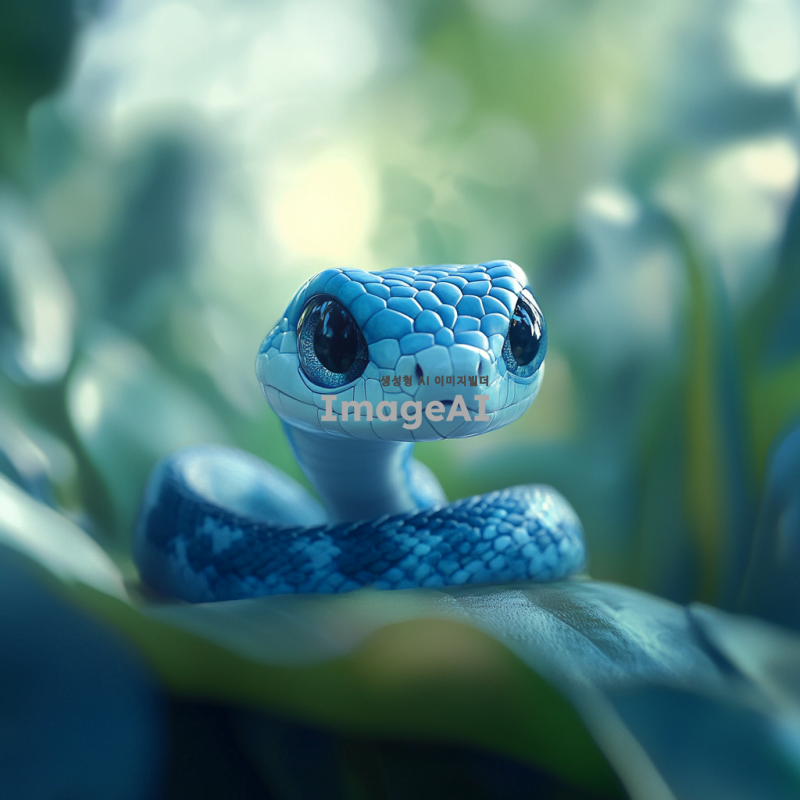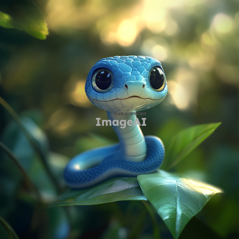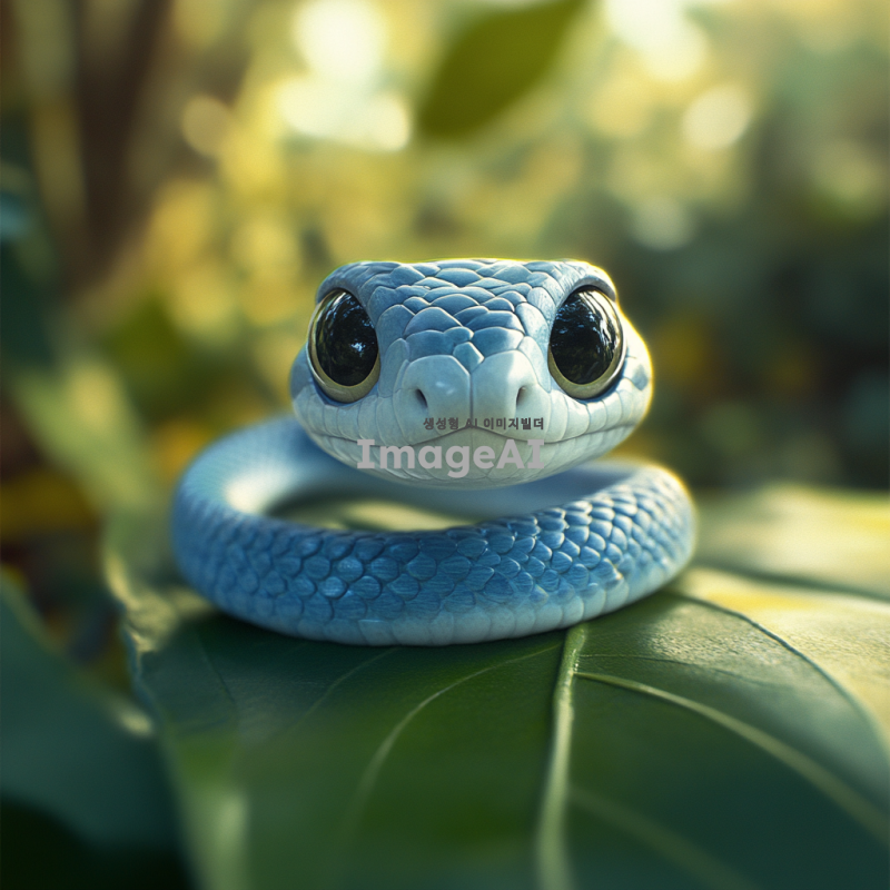작고 귀여운 푸른색 뱀, 부드러운 비늘, 큰 눈으로 호기심 가득한 표정, 자연 속에서 나뭇잎 위에 앉아 있는 모습, 밝고 화사한 배경, 사랑스러운 분위기, 동화 같은 느낌. 무섭고 징그럽지않은 애니메이션같은 느낌, 일러스트 같은 느낌