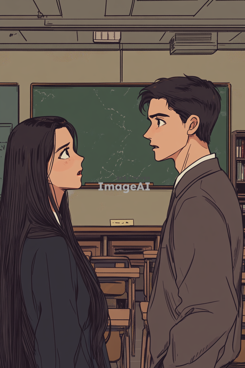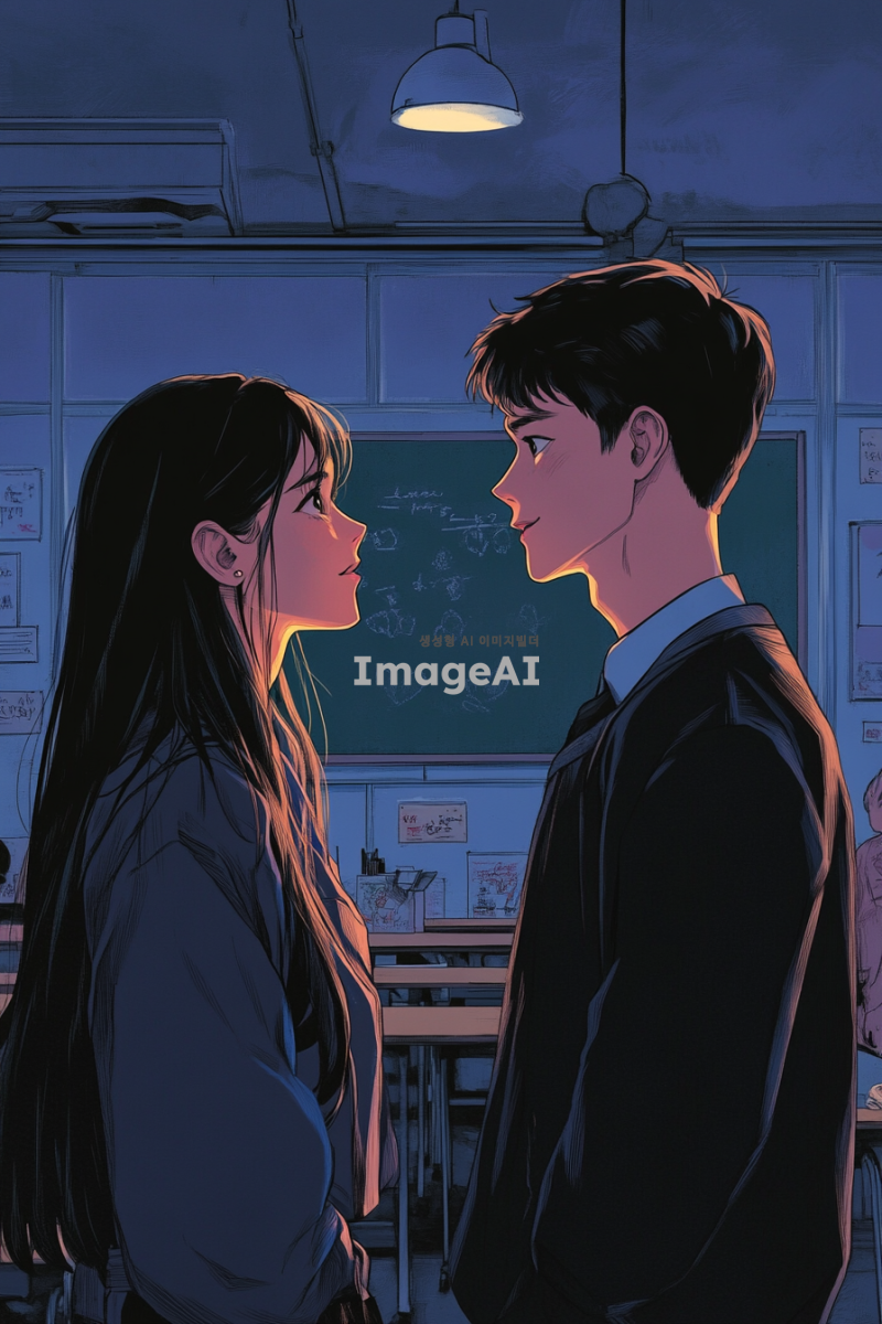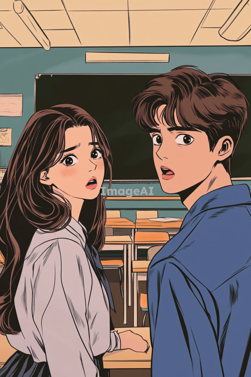 학교 교실 안에서 서로를 바라보며 떨리는 순간을 맞이하는 여학생과 남학생의 모습. 여학생은 긴 생머리에 교복을 입고, 부끄러워하는 표정을 지으며 고백하는 모습. 남학생은 짧은 머리에 편안한 교복을 입고, 놀라면서도 행복한 표정을 짓고 있는 모습. 배경은 교실의 책상과 칠판이 보이는 아늑한 분위기로, 두 사람 사이에 긴장감과 설렘이 느껴지는 장면. 웹툰 그림체로 생동감 있게 표현.