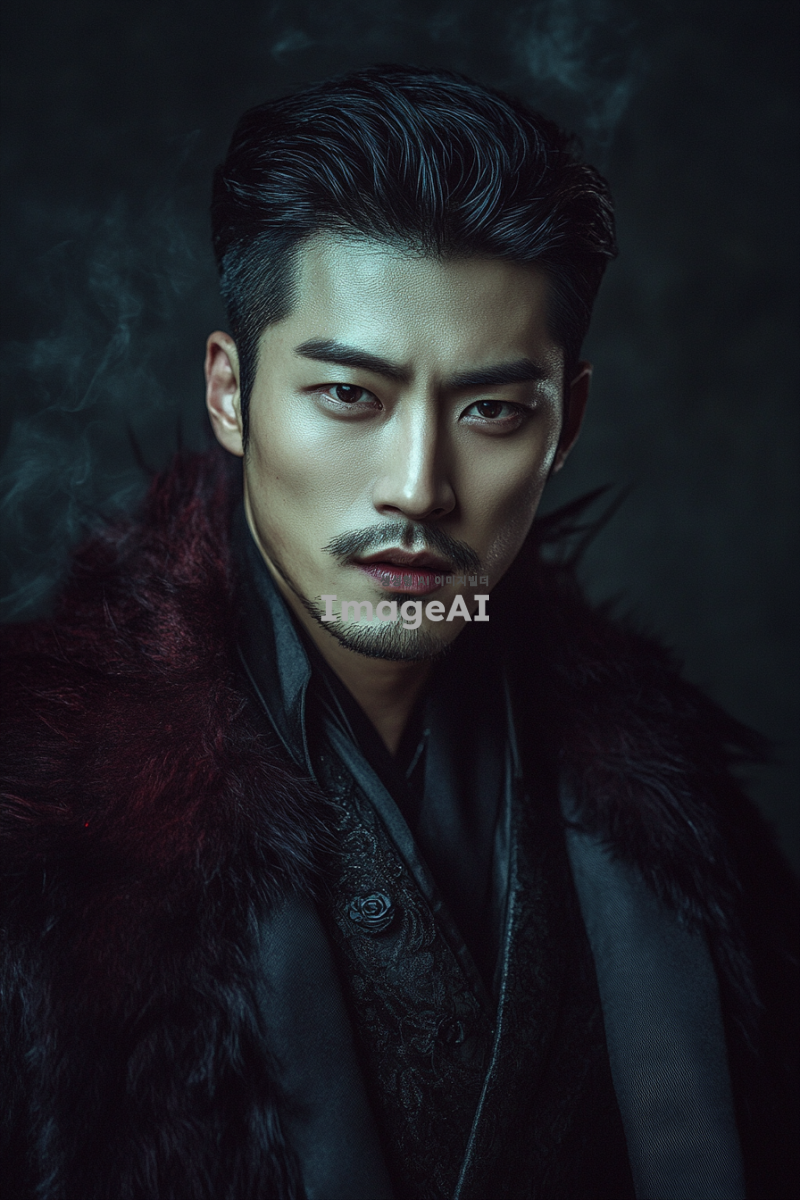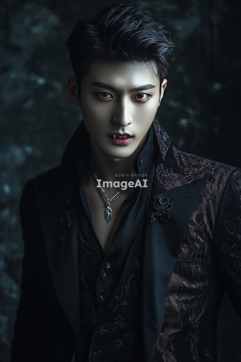 잘생기고 근육 많은 한국인 뱀파이어, 어두운 배경 속에서 강렬한 눈빛을 가진 모습, 세련된 복장과 날카로운 이빨이 강조된 표정, 신비로운 분위기를 자아내는 조명, 고딕 스타일의 요소가 가미된 환경.