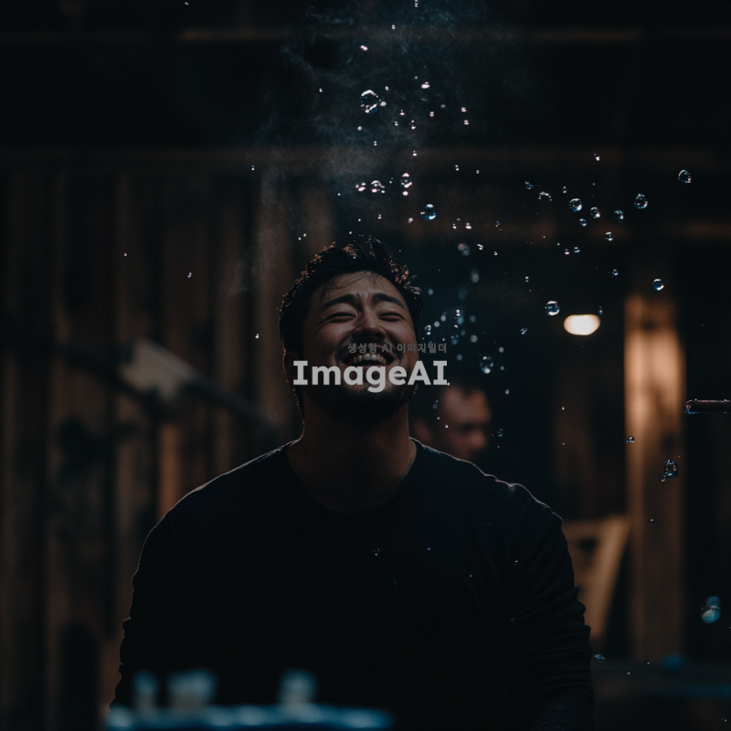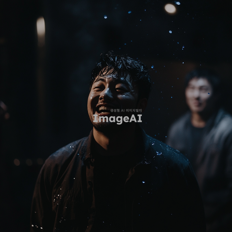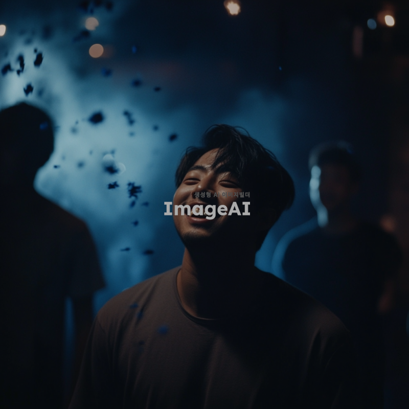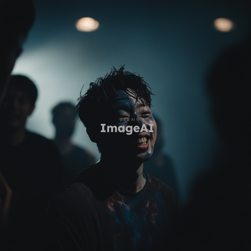 광기에 가득 찬 눈을 가진 한국 남자가 파란 페인트가 튀기는 현장에서 환히 웃고 있는 모습. 배경은 어두운 분위기로, 주변에는 남자만 있으며, 사이코페스