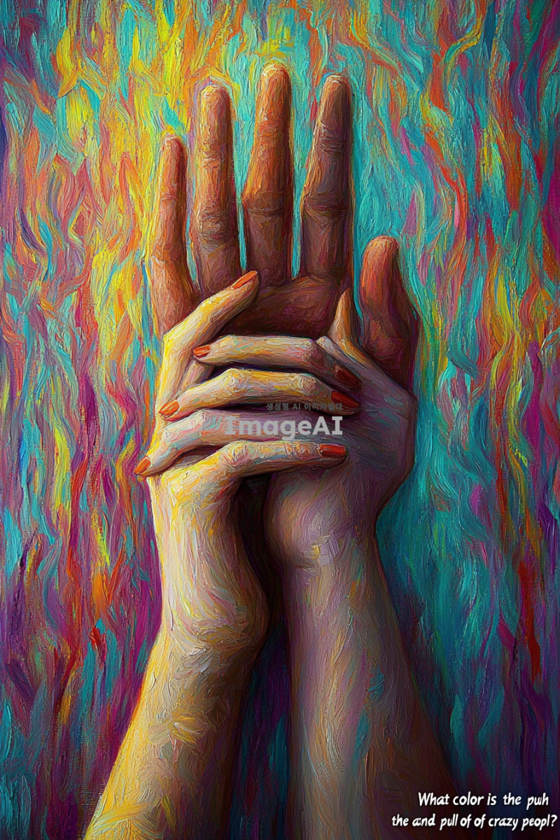 '미친놈들의 밀당은 어떤색입니까'를 주제로 무지개 빛의 색 유화 일러스트. 색과 빛의 조화가 어우러지고, 유화의 붓터치 질감이 살아있는, 열정과 냉정, 번영과 쇠퇴를 동시에 느낄 수 있는.