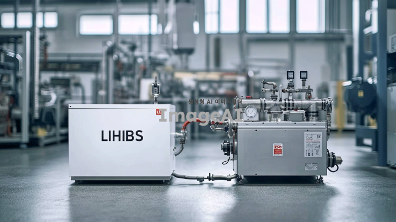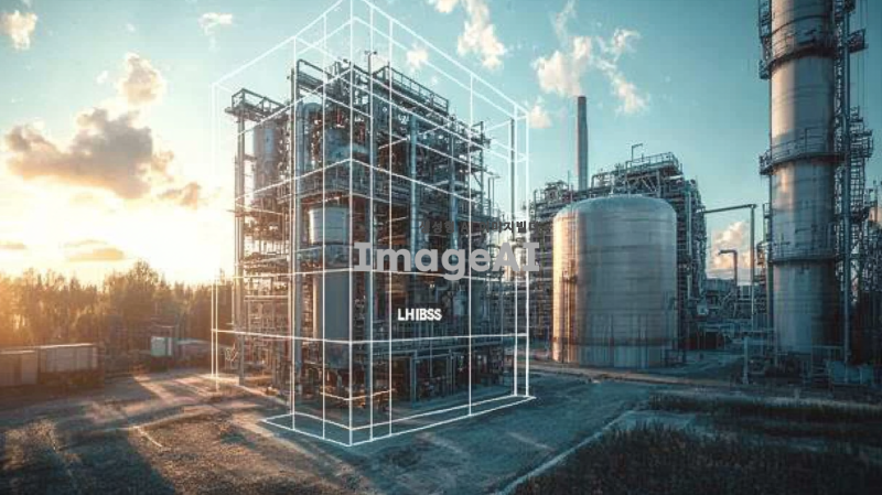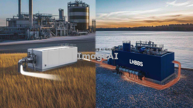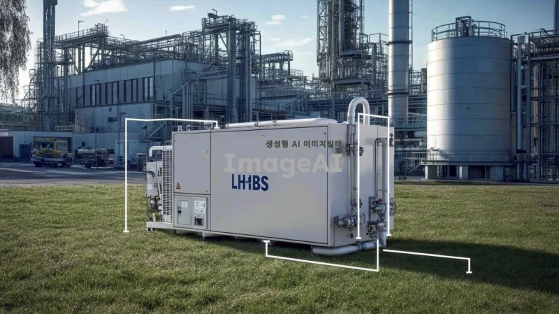 공장 배경의 이미지로, 그림을 두 개로 나누어 LHBS라는 이름의 직사각형 설비와 DCC라는 원통형 설비의 연결 전과 후의 차이를 표현합니다. LHBS 설비는 가로와 높이 비율이 1:1.5인 흰색 직사각형으로, 앞에는 'LHBS'라는 글자가 있습니다. 연결 전에는 LHBS와 DCC의 크기 비율이 1:1로 설정되어 있으며, 연결 후에는 LHBS와 DCC의 크기 비율이 4:1로 변화합니다. LHBS에서 나오는 배관이 DCC의 아래쪽으로 연결된 모습이 담겨 있어야 합니다.