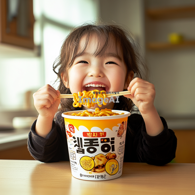 미국 여자 아이가 밝게 웃으며 컵라면에서 떡볶이를 들고 먹고 있는 모습, 따뜻한 조명 아래에서 즐거운 분위기, 다양한 색상의 컵라면과 떡볶이, 배경은 아늑한 주방이나 식탁, 아이의 표정은 행복하고 즐거움이 가득한 모습으로 표현.