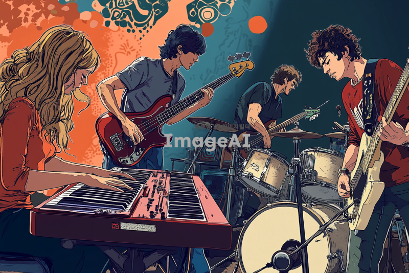 그림의 왼쪽부터 오른쪽 순서대로 사람들이 6명 있어. 왼쪽부터 오른쪽 순서대로 앉아서 건반 연주하는 긴 웨이브 머리 여자 1명, 일렉기타 치는 남자 2명, 베이스 치는 남자 1명, 웨이브 의 짧은 머리 보컬 남자 1명, 웨이브의 짧은 머리 드럼 남자 1명 있어야 해