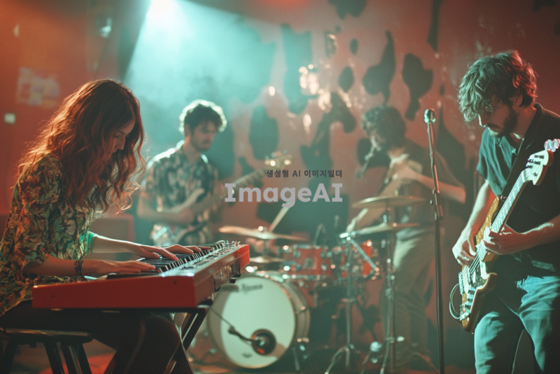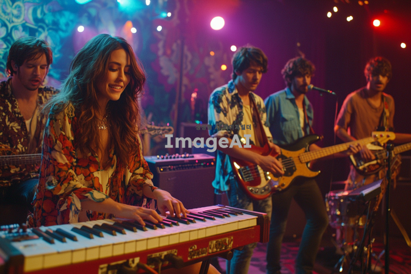 왼쪽부터 오른쪽으로 6명의 사람들이 있는 장면. 첫 번째로 긴 웨이브 머리를 가진 여성이 앉아서 건반을 연주하고 있으며, 두 번째와 세 번째는 일렉기타를 치고 있는 남성 두 명, 네 번째는 베이스를 연주하는 남성 한 명, 다섯 번째는 짧은 웨이브 머리의 남성 보컬, 마지막으로 여섯 번째는 짧은 웨이브 머리의 남성 드러머가 있습니다. 모두 음악에 몰두하고 있는 모습으로, 배경은 공연 무대처럼 꾸며져 있습니다.