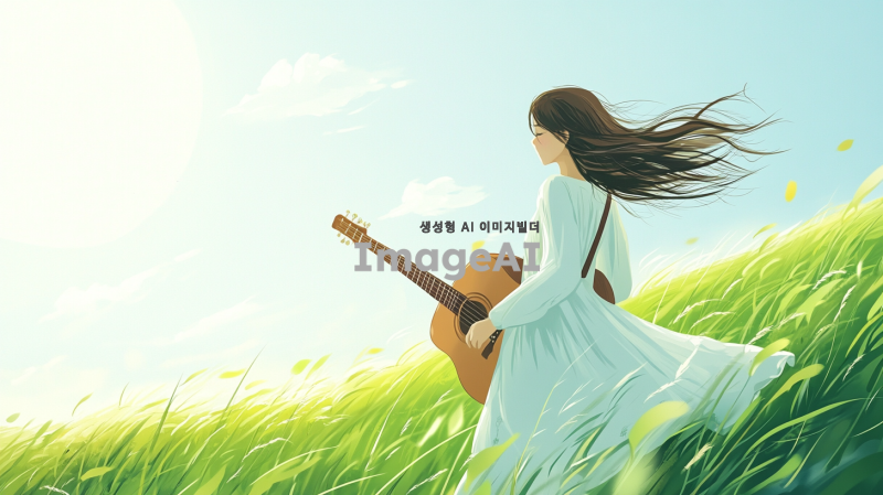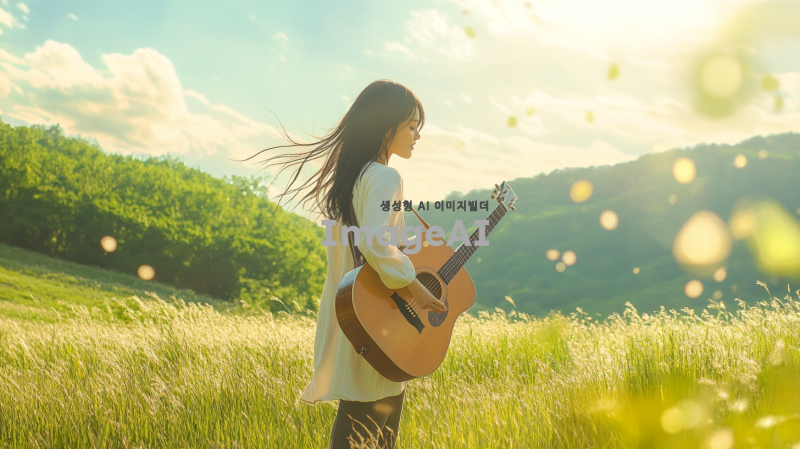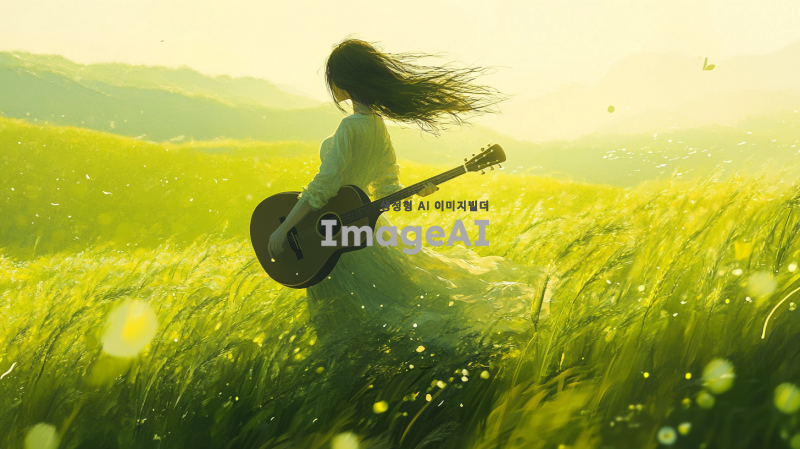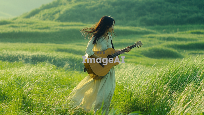 푸른 들판을 배경으로 기타를 메고 걸어가는 한국인 여인의 모습. 자연의 아름다움과 평화로운 분위기를 강조하며, 여인은 편안한 옷차림을 하고 있다. 햇살이 비추는 가운데, 바람에 살짝 흔들리는 풀과 함께 여인의 머리카락이 부드럽게 날리는 장면을 표현.