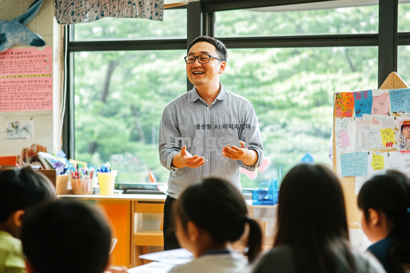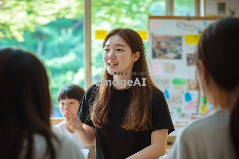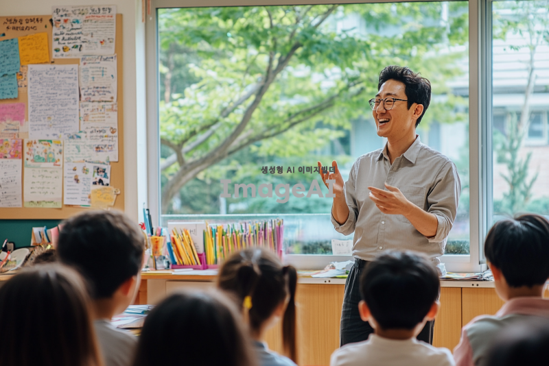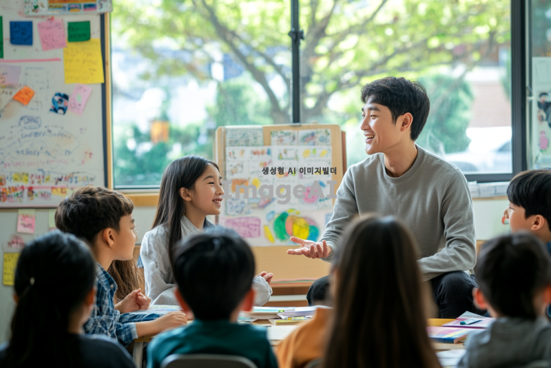 한국의 교실에서 학생들과 소통하는 선생님의 모습. 따뜻한 미소를 지으며 학생들과 대화하는 장면, 다양한 인종의 학생들이 함께 모여 있는 모습, 교실의 벽에는 교육적인 포스터와 학생들의 작품이 걸려있고, 창문 밖으로는 푸른 나무가 보이는 밝고 긍정적인 분위기. 선생님은 편안한 복장을 하고 있으며, 학생들은 활발하게 의견을 나누고 있는 모습.