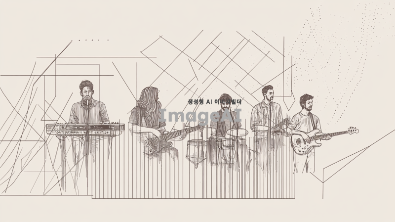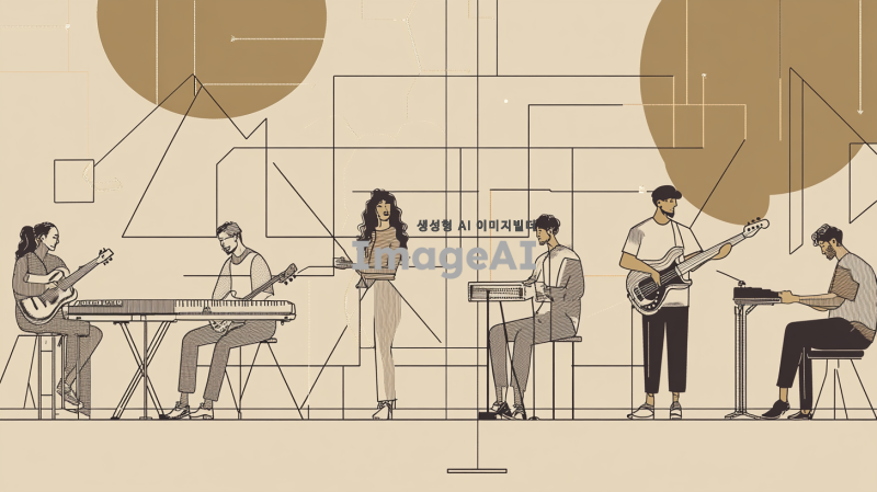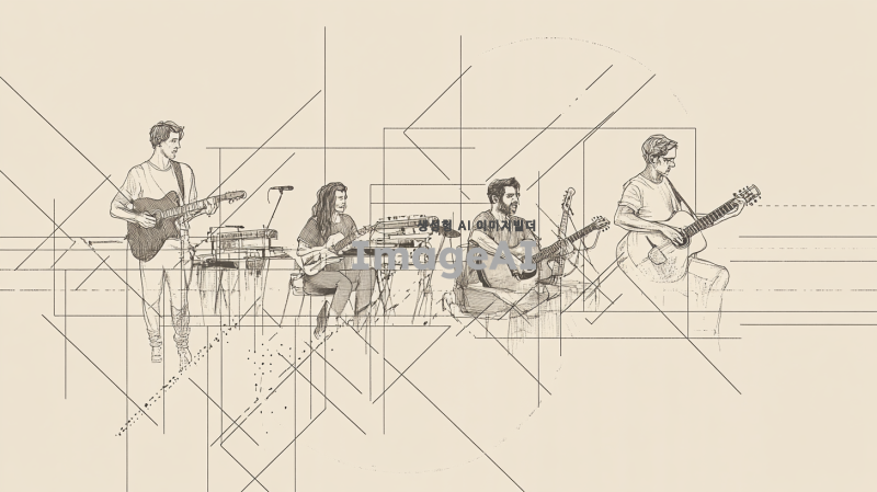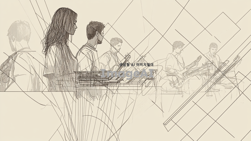 그림의 왼쪽부터 오른쪽 순서대로 사람들이 한 줄로 6명 있어. 왼쪽부터 오른쪽 순서대로 얘기해줄게. 건반 연주하는 긴 웨이브 머리 여자 1명, 일렉기타 치는 남자 2명, 베이스 치는 남자 1명, 웨이브 의 짧은 머리 보컬 남자 1명, 웨이브의 짧은 머리 드럼 남자 1명 있어야 해. 그리고 앉아서 통기타 치는 남자 1명, 여자 1명, 건반 연주하는 짧은 머리 여성이 한 명이 앞 줄에 있어.
