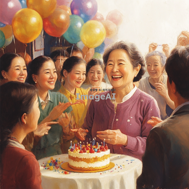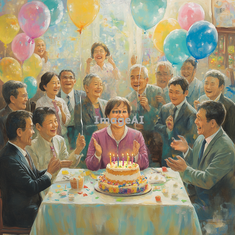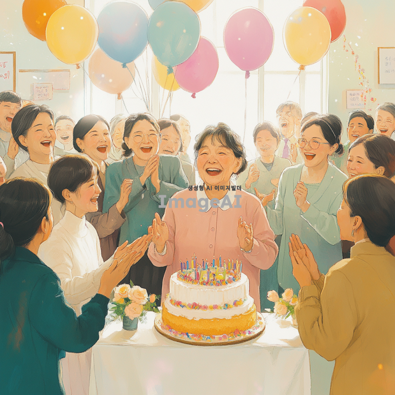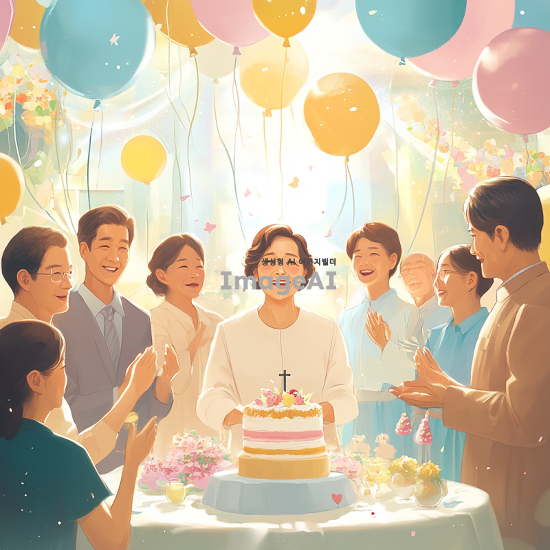 꿈이 가득한 교회의 교우들이 김순덕 집사님의 생신을 축하하는 장면을 그려주세요. 밝고 따뜻한 분위기 속에서 교우들이 모여 집사님을 위해 축하의 메시지를 전달하고, 생일 케이크와 풍선으로 꾸며진 공간에서 웃고 있는 모습이 담겨야 합니다. 김순덕 집사님은 중년의 한국 여성으로, 친근하고 사랑스러운 미소를 지으며 교우들과 함께 기뻐하는 모습이 그려져야 합니다. 배경은 화사하고 행복한 느낌을 주는 색감으로 가득 차 있어야 합니다.