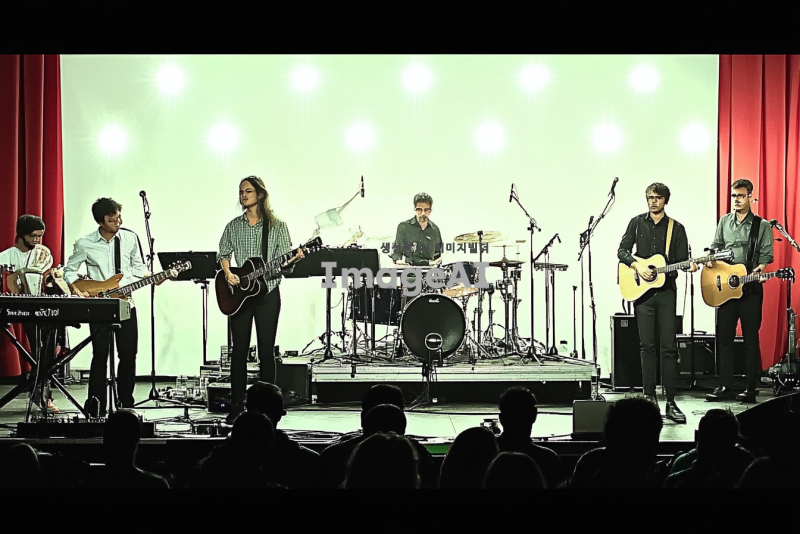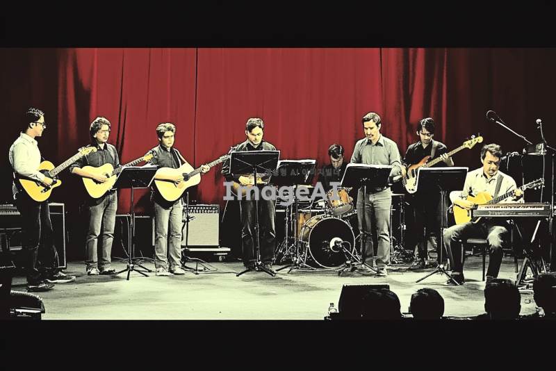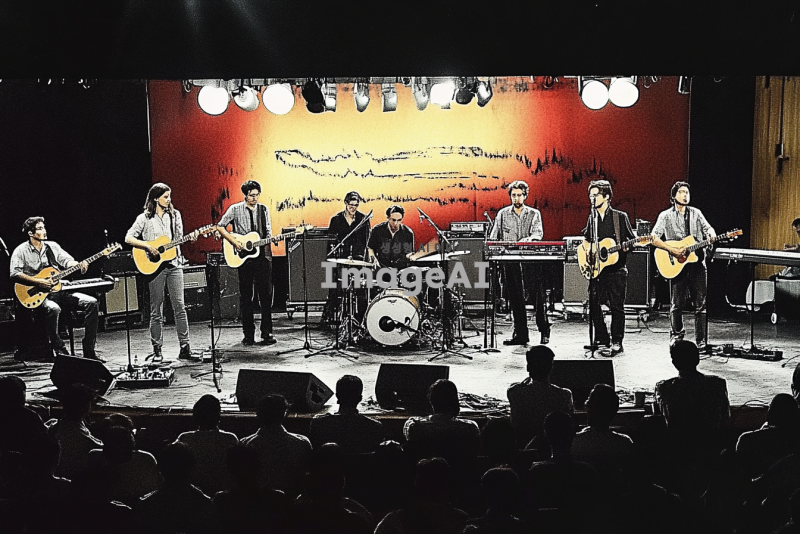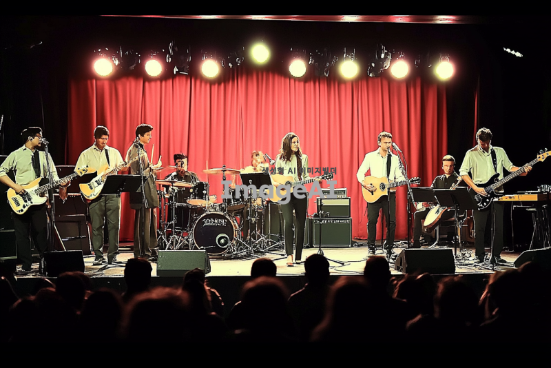 무대 위에서 연주하는 12명의 음악가들. 뒷줄에는 서서 연주하는 8명이 있다. 왼쪽부터 오른쪽으로 긴 웨이브 머리의 여자 건반 연주자, 일렉기타를 치는 남자 2명, 베이스를 치는 남자 1명, 짧은 웨이브 머리의 보컬 남자 3명, 짧은 웨이브 머리의 드럼 남자 1명이 배치되어 있다. 앞줄에는 앉아서 연주하는 4명이 있다. 왼쪽부터 짧은 머리의 여자 건반 연주자, 짧은 머리의 여성 통기타 연주자, 통기타를 치는 남자 2명이 자리잡고 있다. 무대 조명은 화려하게 비추고, 관객들이 즐겁게 감상하는 모습이 보인다.