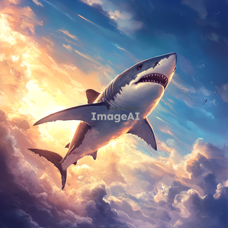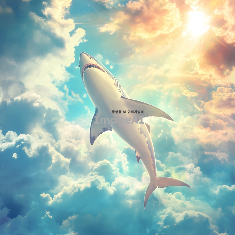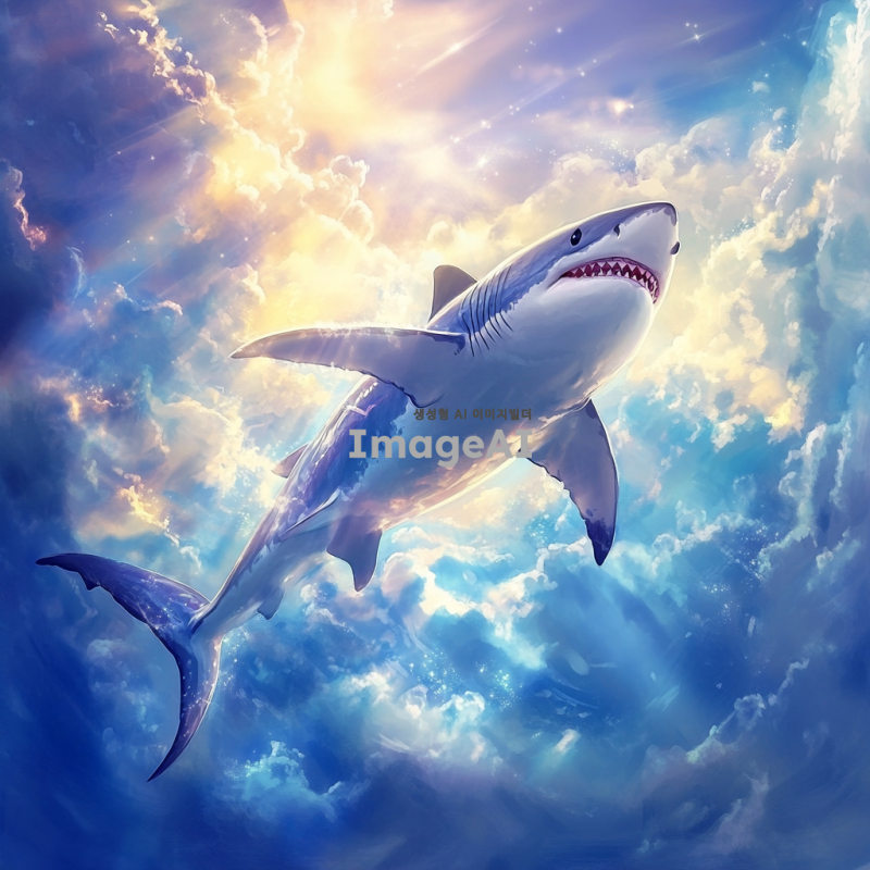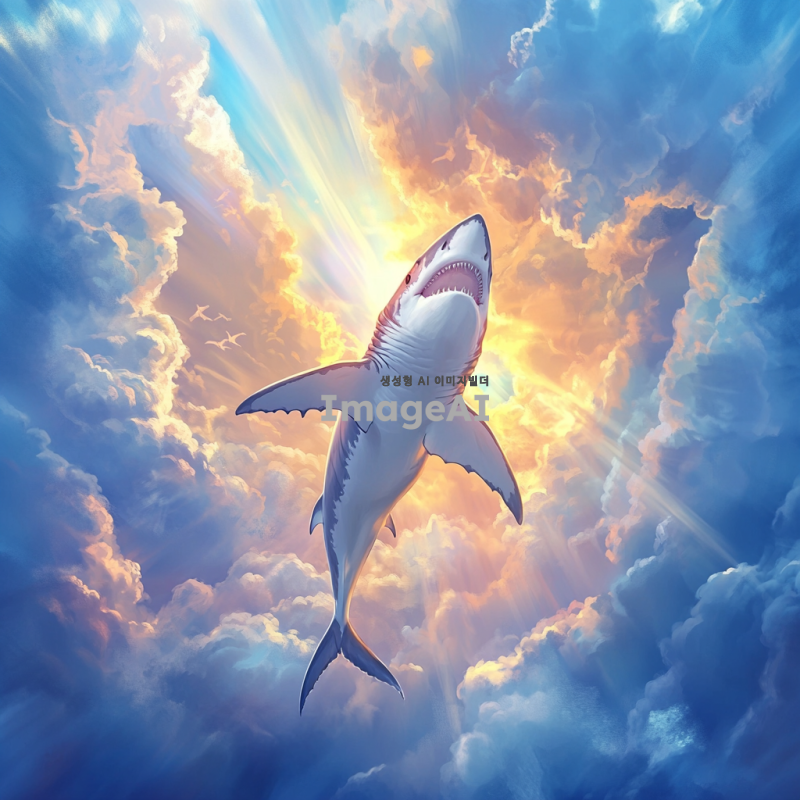 하늘을 나는 상어, 푸른 하늘을 배경으로 한 상어의 모습, 구름 사이를 유유히 떠다니는 상어, 햇빛이 비치는 장면, 신비로운 분위기, 다채로운 색상의 구름, 상어의 생동감 있는 표정, 상어의 비늘이 반짝이는 모습, 초현실적인 풍경, 상어가 하늘을 나는 모습의 상징성 강조