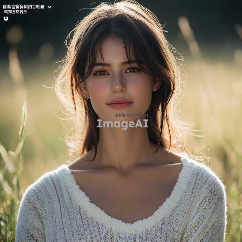 한 여성이 우아한 의상을 입고, 부드러운 표정으로 카메라를 바라보며 미소 짓고 있는 모습. 배경은 자연 풍경으로, 햇살이 부드럽게 비추고 있어 따뜻한 분위기를 연출. 그녀의 헤어스타일은 길고 자연스럽게 흐르는 웨이브로, 화사한 메이크업이 돋보인다. 전체적으로 여성스러운 매력과 함께 우아함이 느껴지는 이미지.