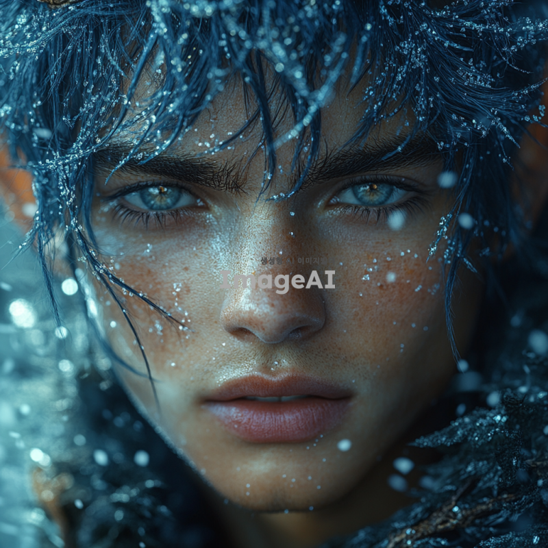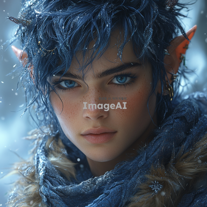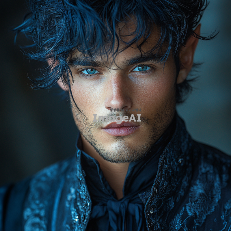군청색 머리를 가진 미청년, 엘프 귀를 가진 단발 스타일의 남성, 환상적인 배경과 함께, 부드러운 표정, 세련된 의상, 자연광이 비치는 모습, 신비로운 분위기.