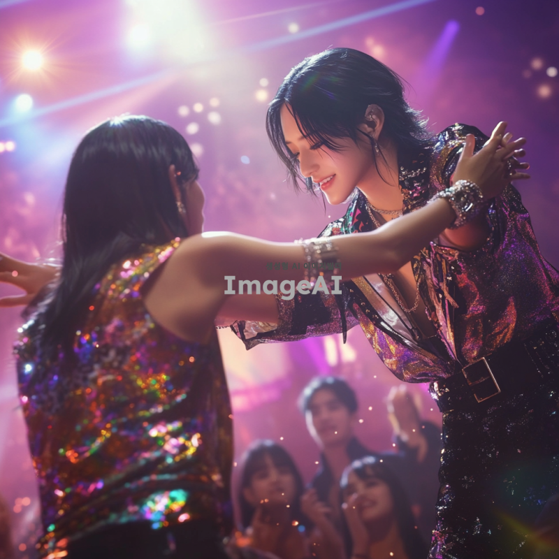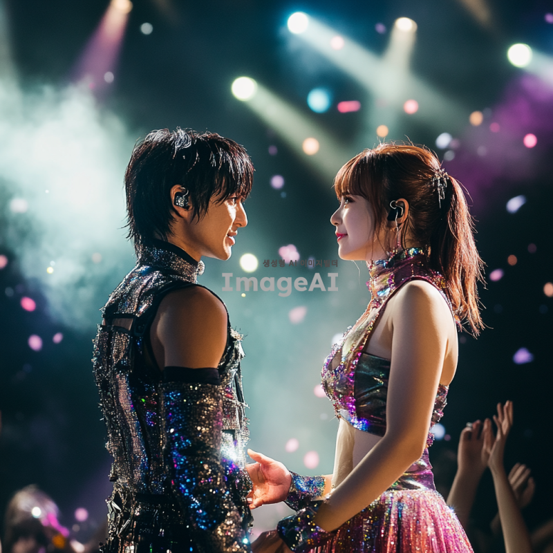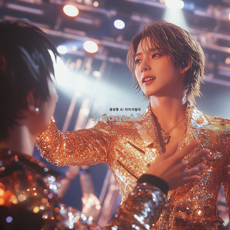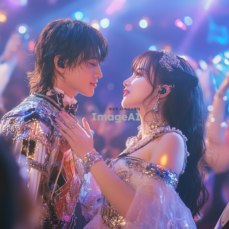 아이돌이 무대에서 관객 한 명에게 손을 내밀고 서로를 가까이 마주보고 있는 장면. 아이돌은 화려한 무대 의상을 입고 있으며, 관객은 감동한 표정으로 아이돌을 바라보고 있다. 무대 배경에는 조명이 화려하게 빛나고 있으며, 관객석에는 다른 팬들이 열광하는 모습이 보인다. 분위기는 따뜻하고 감정이 넘치는 순간을 포착하고 있다.