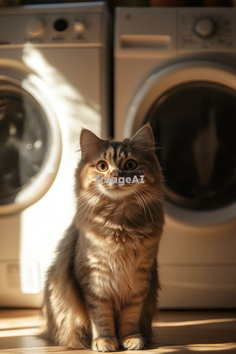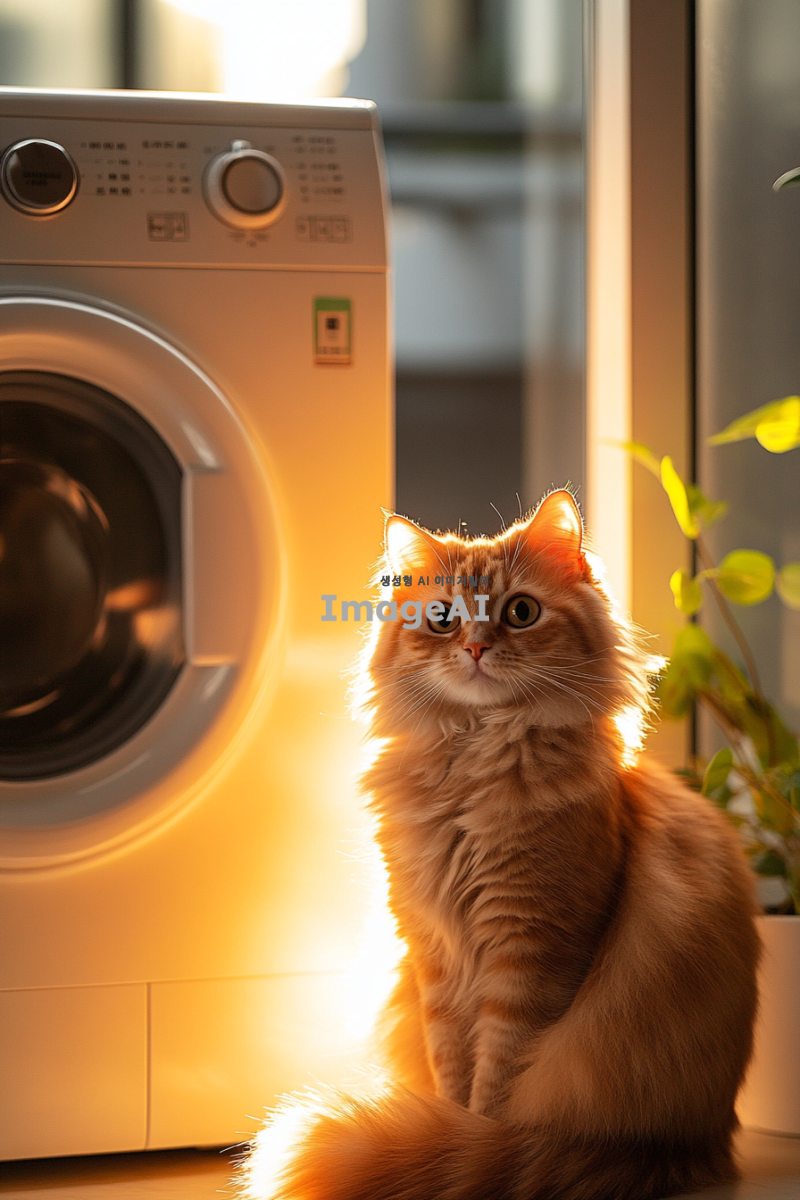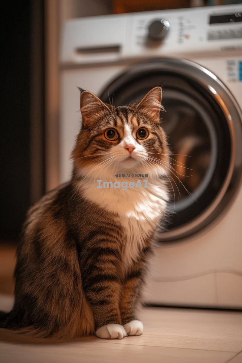 고양이가 세탁기 앞에 얌전히 앉아 있는 모습, 부드러운 털과 큰 눈을 가진 한국 고양이, 세탁기에서 나오는 따뜻한 빛, 아늑한 실내 배경, 고양이의 귀여운 표정과 편안한 자세 강조
