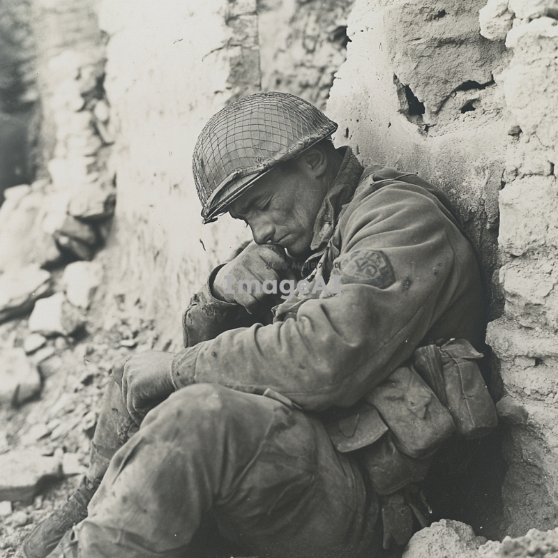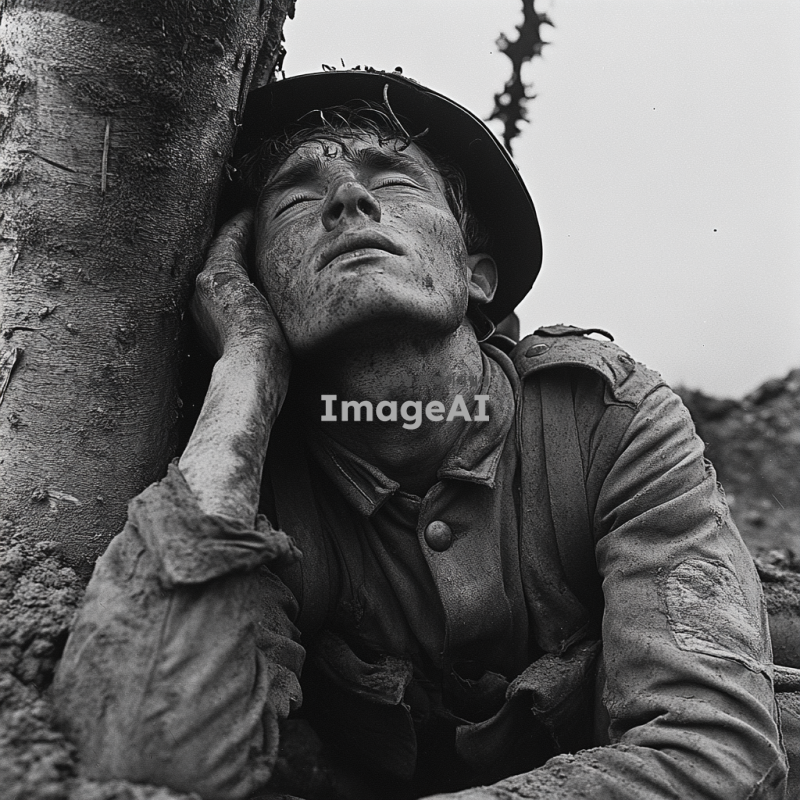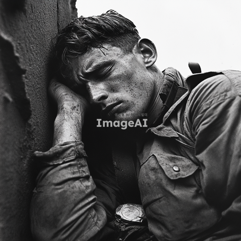전쟁 중에 한 병사가 지쳐있는 느낌