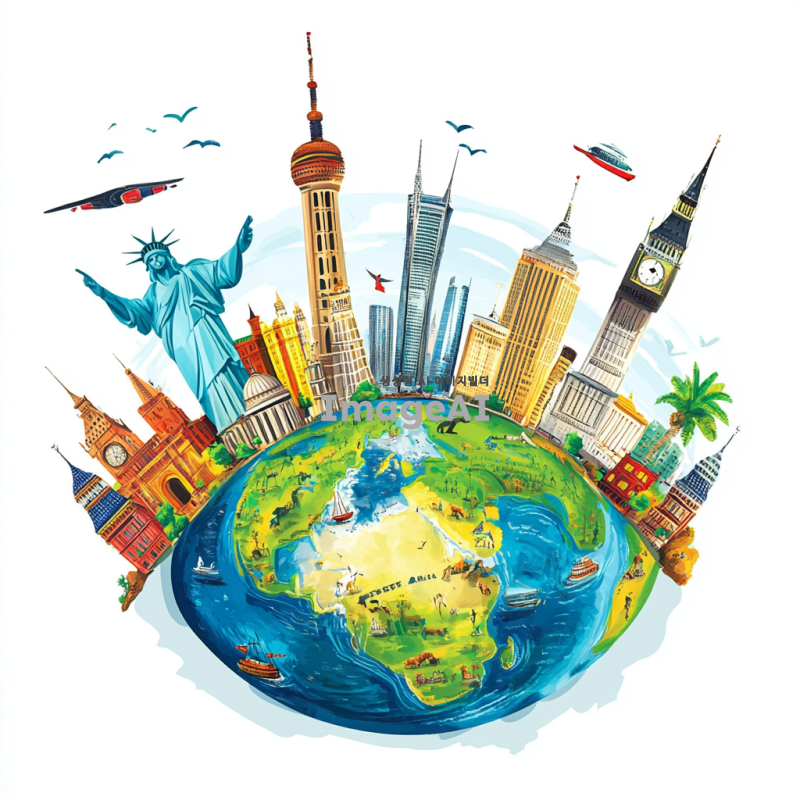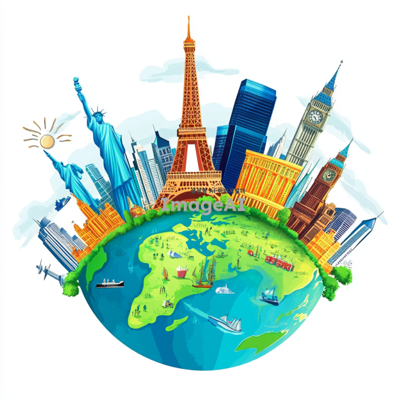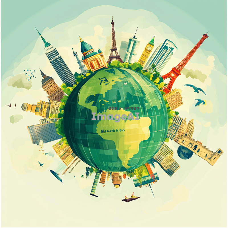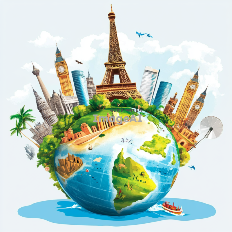 여행을 위한 지구본, 다양한 국가와 도시의 랜드마크가 생생하게 표현된 디자인, 밝고 선명한 색상, 현대적인 느낌의 스타일, 배경은 자연 풍경으로 설정, 여행의 즐거움을 느낄 수 있는 요소들 포함