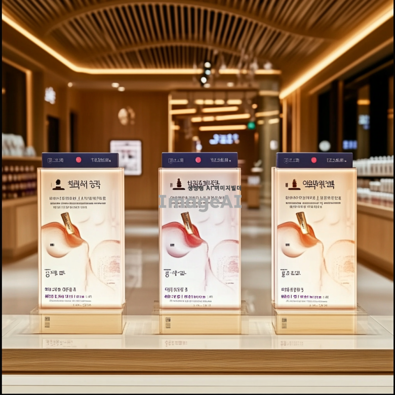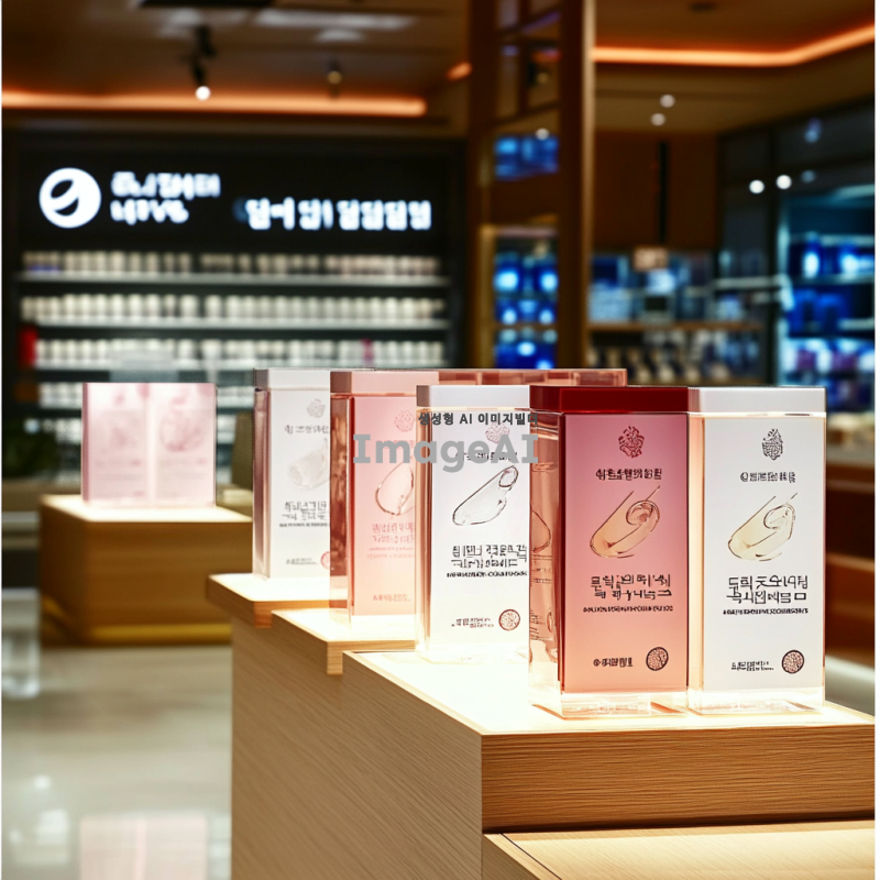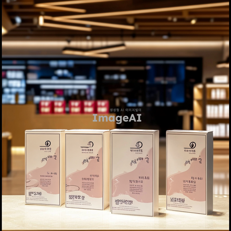 세 개의 동일한 상품이 나란히 진열되어 있는 모습, 각 상품은 세련된 디자인의 포장으로 둘러싸여 있으며, 배경은 깔끔하고 현대적인 느낌의 상점 내부. 조명은 부드럽고 따뜻한 분위기로, 상품의 디테일이 잘 보이도록 강조. 상품은 한국에서 인기 있는 아이템으로, 소비자들이 관심을 가질 만한 매력적인 요소를 포함.