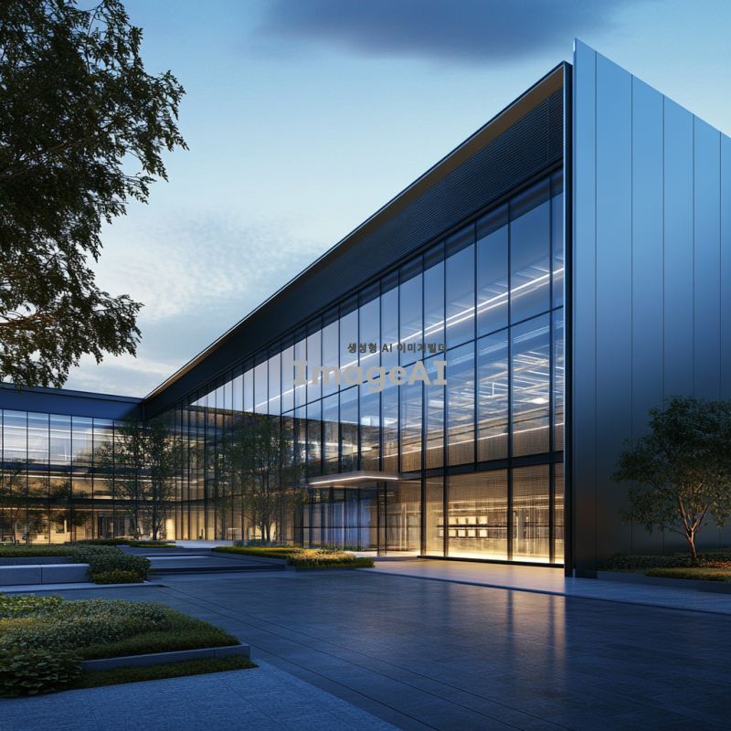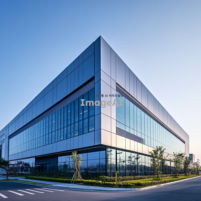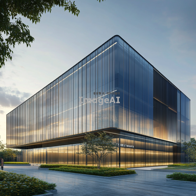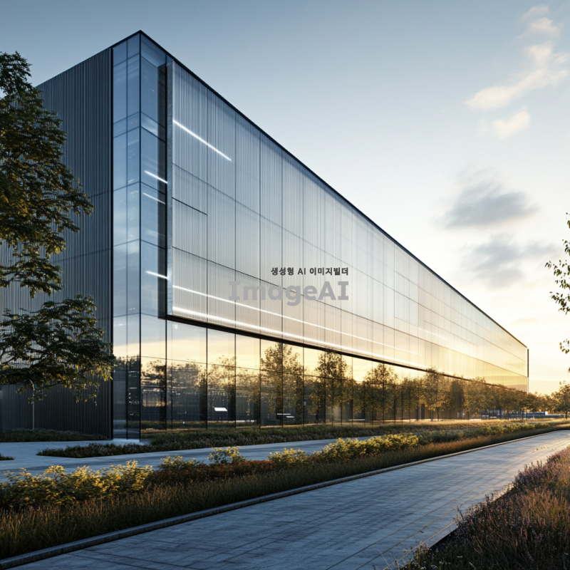 최신 데이터센터의 입면 디자인, 현대적이고 세련된 건축 스타일, 유리와 금속 재질의 조화, 에너지 효율적인 구조, 주변 환경과의 조화, 푸른 식물들이 배치된 모습, 낮 시간의 자연광이 비치는 장면, 기술적인 느낌과 미래지향적인 요소 강조.