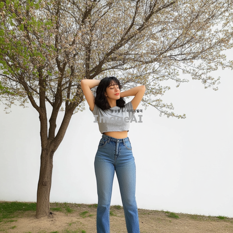 흰색 배경에서 청바지를 입고 바디프로필을 찍은 여성
