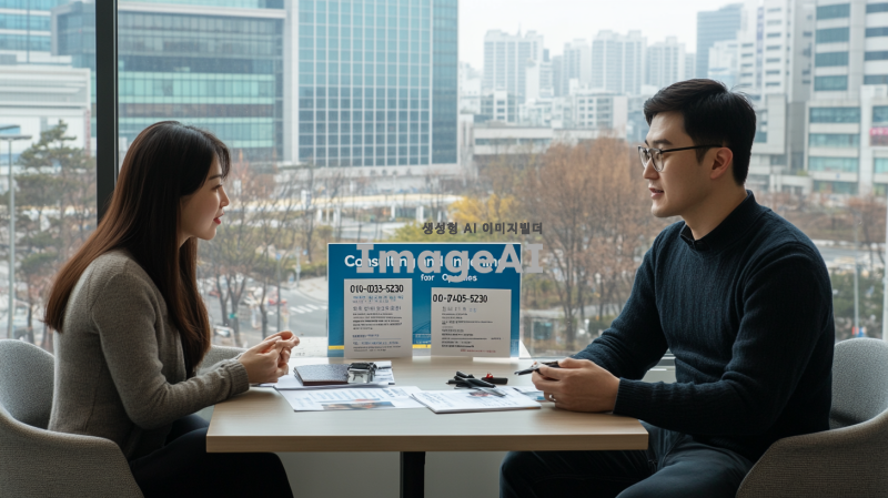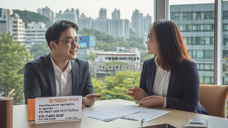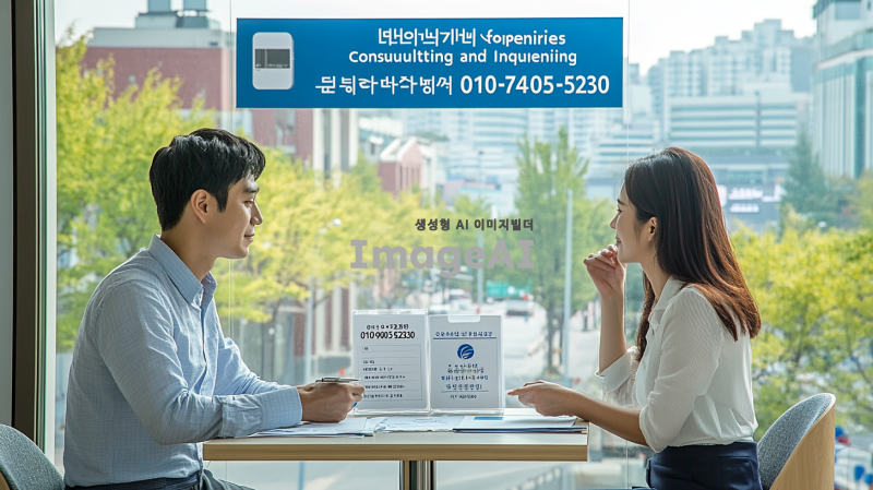 한국의 현대적인 도시 풍경을 배경으로, 상담을 받고 있는 한국인 남성과 여성의 모습. 두 사람은 테이블에 앉아 있으며, 한쪽에는 상담 자료가 놓여 있고, 다른 쪽에는 전화번호가 적힌 명함이 있다. 명함에는 "컨설팅 및 개업문의"라는 문구와 함께 "010-9033-5230", "010-7405-5230"이라는 전화번호가 선명하게 보인다. 주변은 아늑하고 전문적인 분위기로, 창 밖으로는 도시의 모습이 보인다.