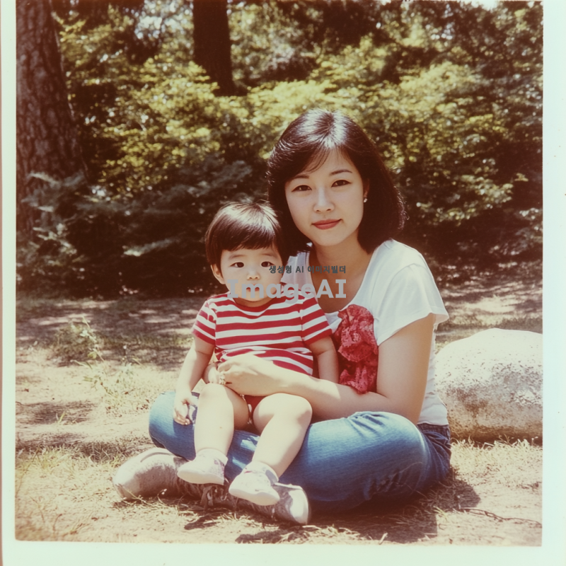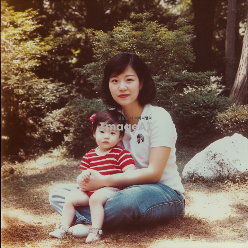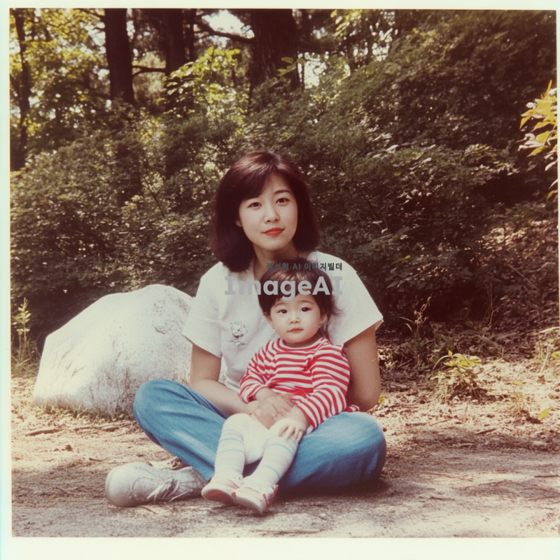 옛날 사진, 아시아계 어머니와 아이가 공원에서 땅에 앉아 있다. 어머니는 빨간 줄무늬 셔츠를 입은 아기 딸을 안고 있다. 그들 뒤에는 초록색 나무가 있고 근처에는 흰색 바위가 있으며, 80년대 스타일의 이미지이다.