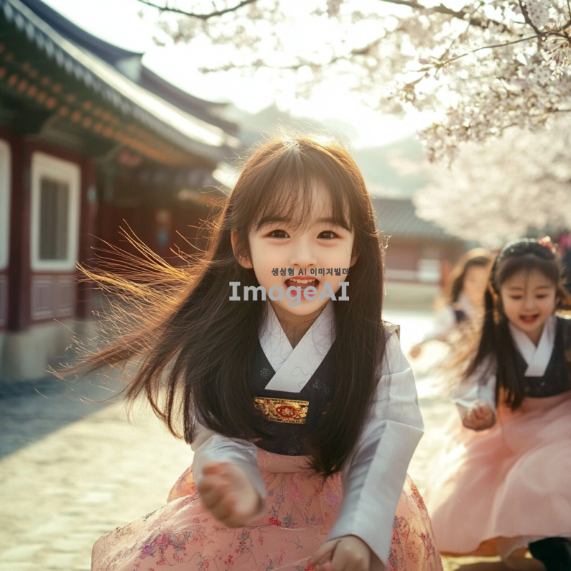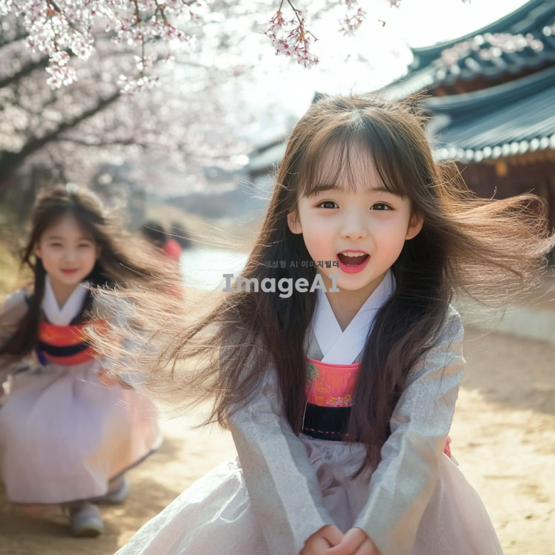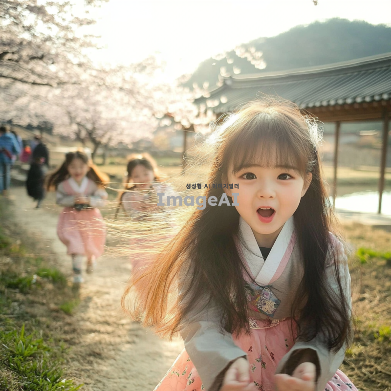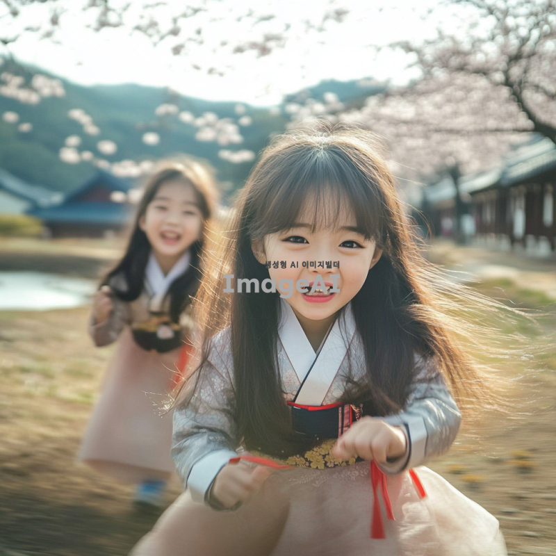 한국의 전통적인 마을에서 놀고 있는 어린아이들, 밝은 햇살 아래에서 웃으며 뛰어노는 모습, 한복을 입고 전통 놀이를 하는 장면, 주변에는 벚꽃 나무와 연못이 있는 아름다운 풍경, 따뜻하고 행복한 분위기.