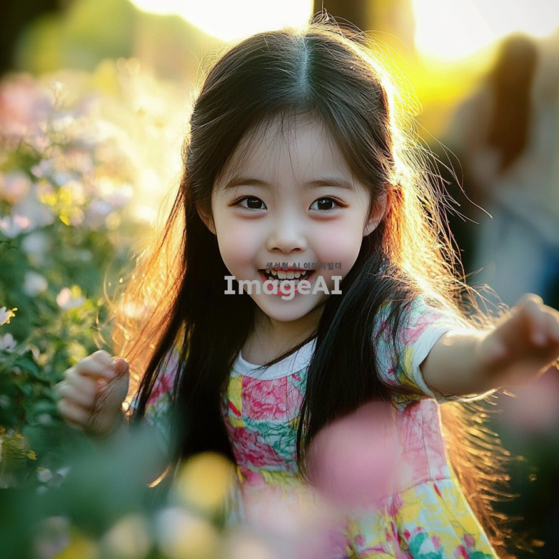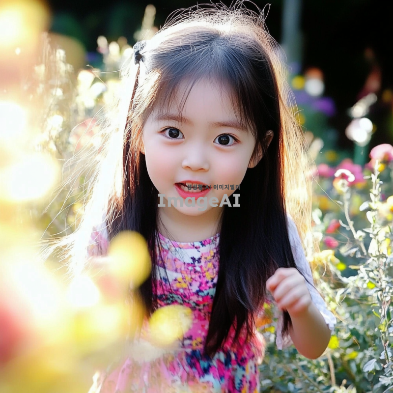 3살 한국인 여자아이, 밝은 웃음을 지으며 놀고 있는 모습, 화사한 색상의 원피스를 입고, 공원에서 꽃과 나무 사이에서 뛰어노는 장면, 따뜻한 햇살이 비추는 배경, 사랑스럽고 천진난만한 표정, 귀여운 헤어스타일, 생동감 넘치는 분위기