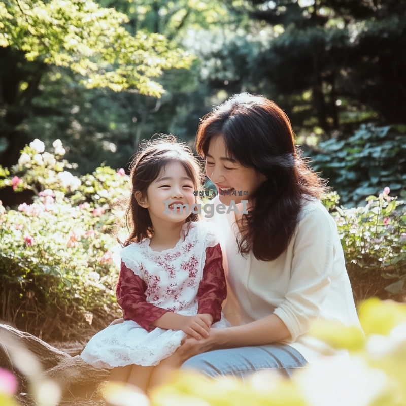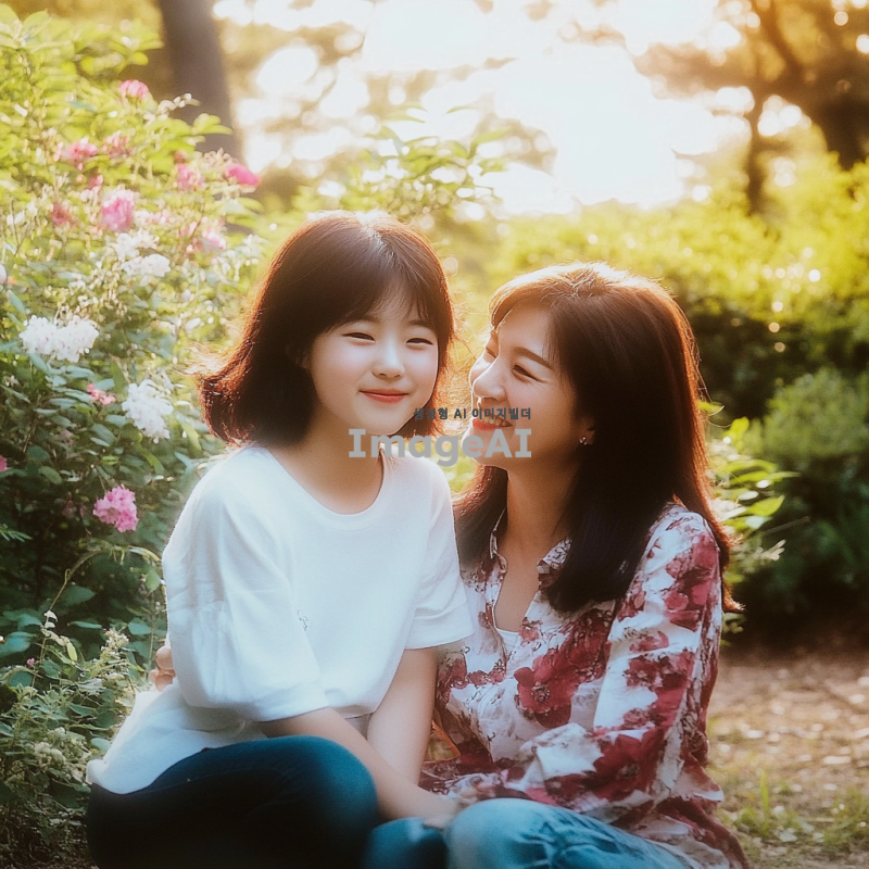 웃으며 서로 쳐다보는 한국인 엄마와 딸 모습, 따뜻한 햇살 아래 공원에서 자연스럽게 웃고 있는 장면, 배경에는 푸른 나무와 화사한 꽃들이 만개해 있는 풍경, 두 사람의 표정은 행복하고 친밀한 느낌을 주며, 서로의 눈을 바라보는 순간을 포착한 이미지.