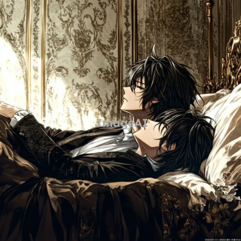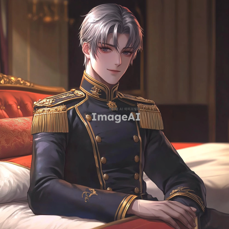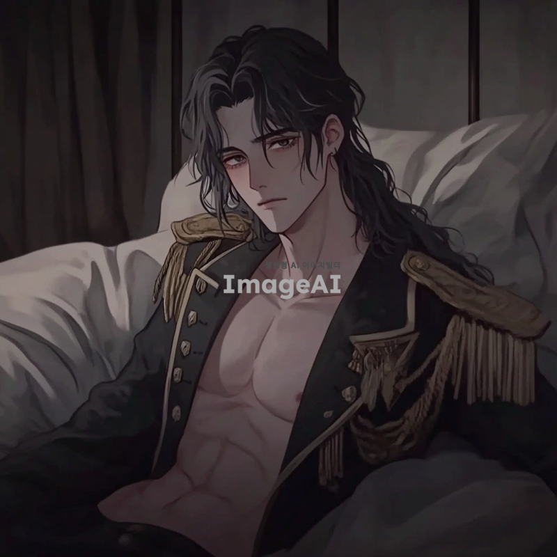 새까만 머리카락과 눈동자를 가진 잘생긴 남성. 머리카락 길이는 평균보다 살짝 긴 정도. 약간 삐딱한 자세로 침대에 걸터앉아 있음. 귀족들이 입을 만한 제복을 입고 있음. 고급스럽고 우아하면서도 어둡고 피폐한 분위기. 나른한 표정.