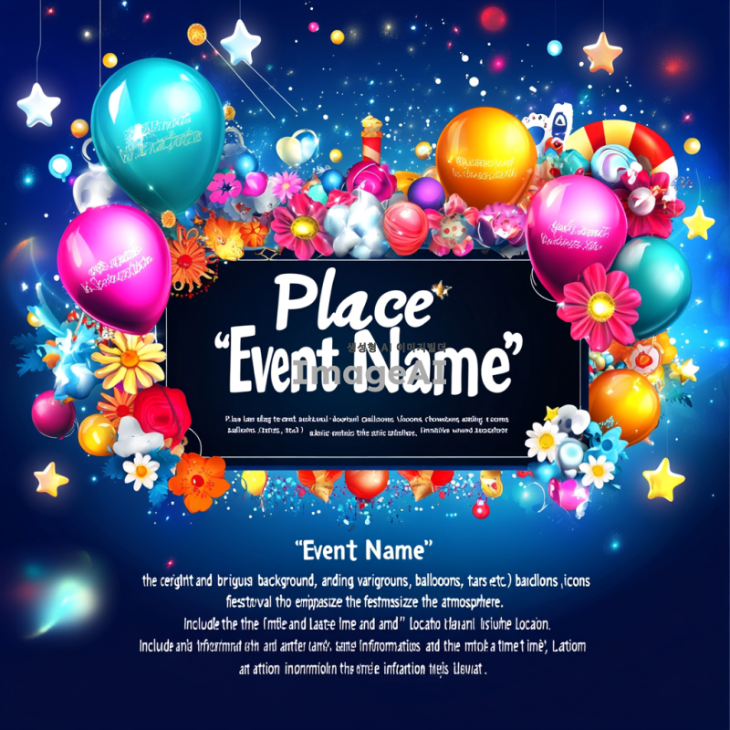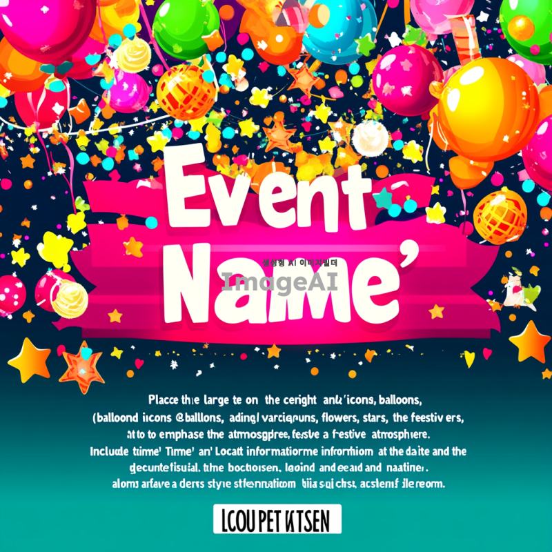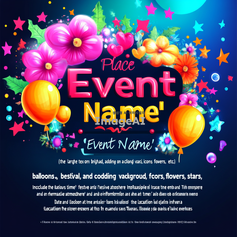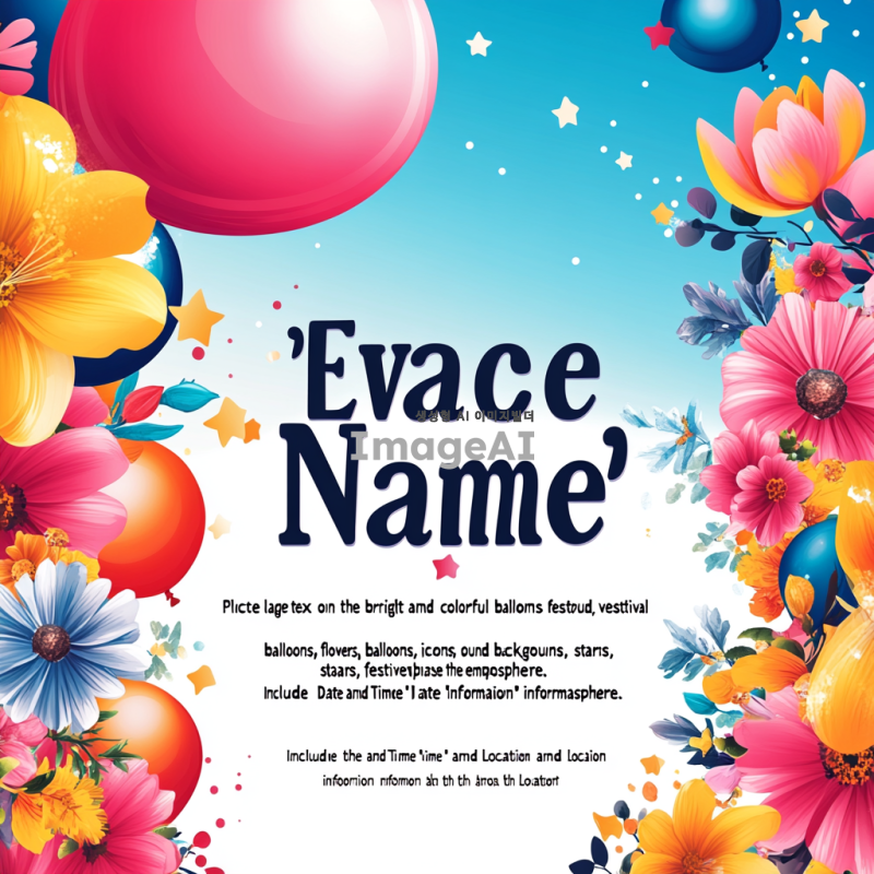 "밝고 다채로운 색상의 배경에 '행사명'이라는 큰 글씨를 중앙에 배치하고, 그 주위에 다양한 축제 아이콘(풍선, 꽃, 별 등)을 추가하여 축제 분위기를 강조합니다. 아래쪽에는 '날짜와 시간', '장소' 정보를 포함하고, 글씨체는 읽기 쉬운 스타일로 설정합니다. 전체적으로 즐거운 느낌을 주는 디자인을 원합니다."