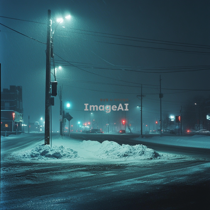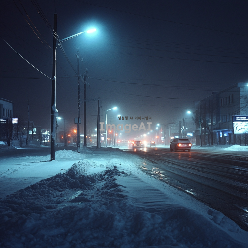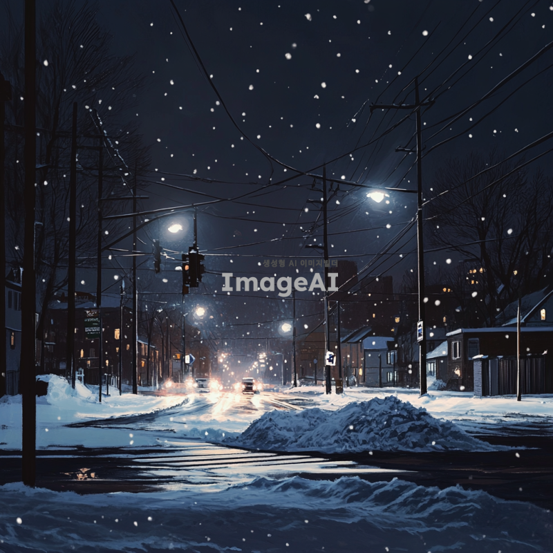 눈이 내리는 밤의 사거리 풍경, 희미한 가로등 불빛이 반짝이고, 드문드문 지나가는 차량의 불빛이 어우러져 몽환적인 분위기를 자아내는 장면. 도로 위에는 쌓인 눈이 반짝이며, 주변 건물들은 조용히 잠들어 있는 모습.