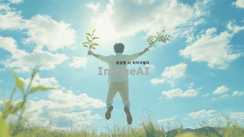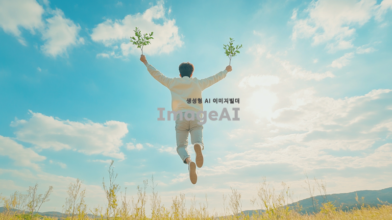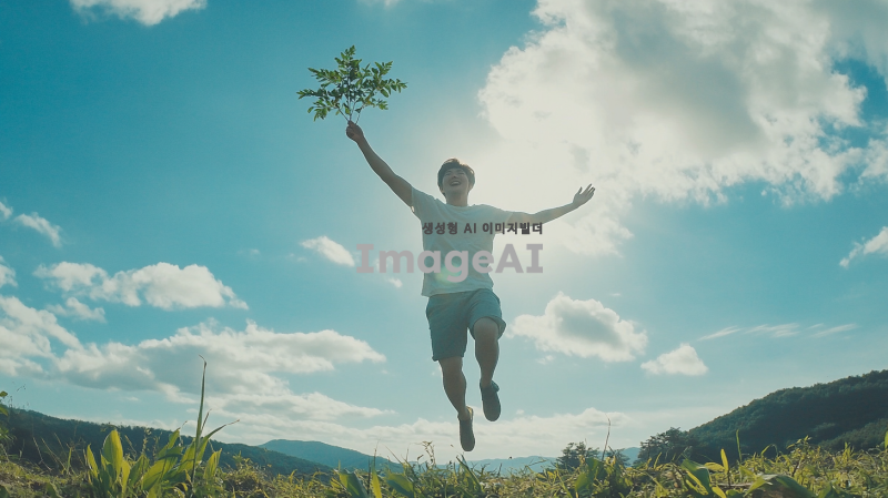 밝은 햇살 아래에서 새로운 시작을 준비하는 한국인 남성이 힘차게 뛰어오르는 모습, 배경에는 푸른 하늘과 아름다운 자연 풍경이 펼쳐져 있고, 그의 표정은 희망과 결단력이 가득 차 있으며, 손에는 작은 나무 묘목을 들고 있음. 전체적인 분위기는 긍정적이고 활기차며, 새로운 도약을 상징하는 요소들이 가득한 장면.