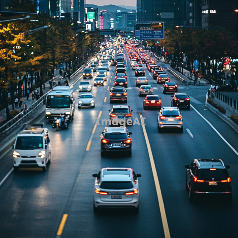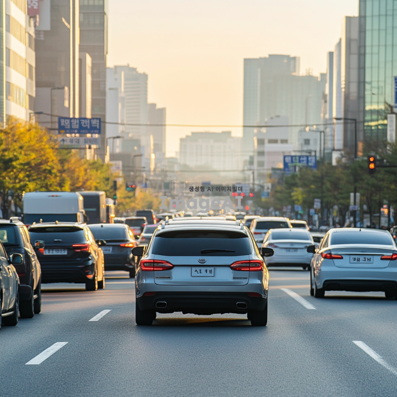 한국의 도시 도로에서 주행 중인 현대적인 자동차, 주변에는 다른 차량과 보행자가 어우러진 도시의 활기찬 모습,현재 운행되는 차량 모델과 같은 사실적인 사진,2종