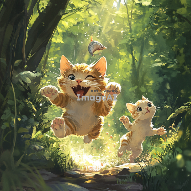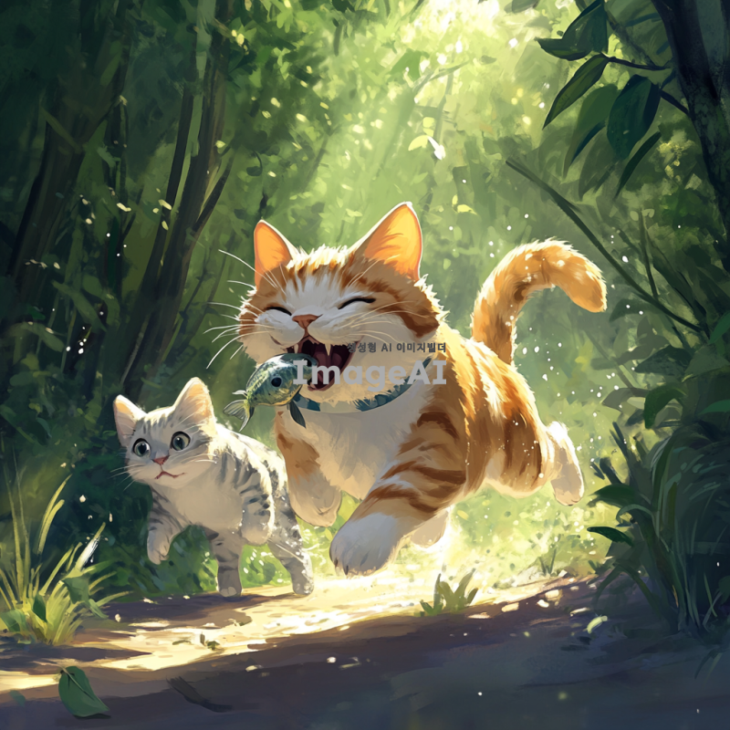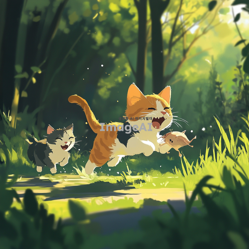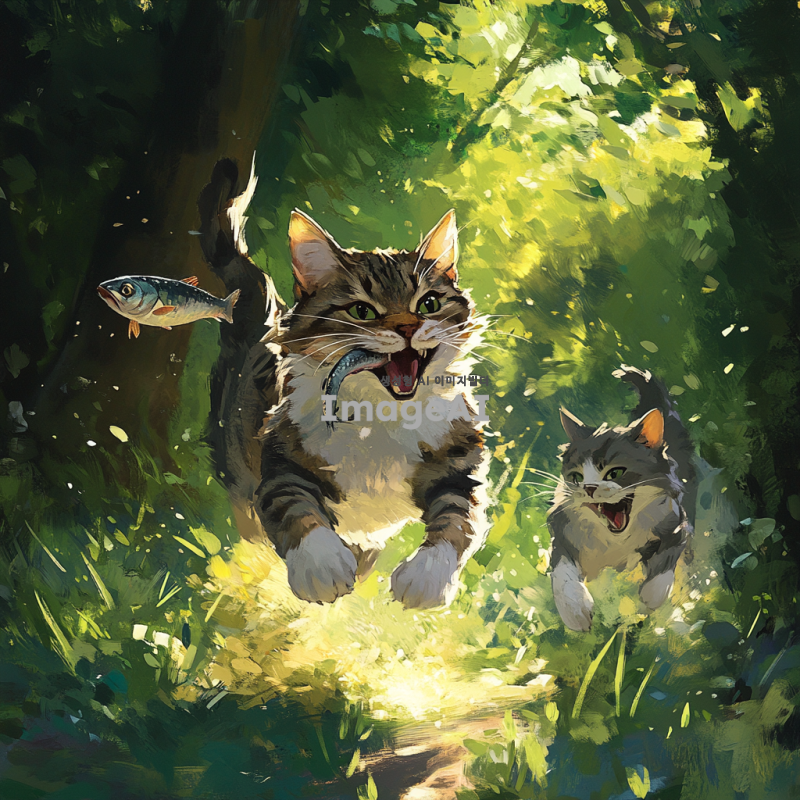 고양이가 먹이를 물고 신나게 뛰어가고, 그 뒤에서 다른 고양이가 쫓아오고 있는 장면. 배경은 자연의 숲속으로, 햇빛이 비치는 푸른 나무와 풀밭이 어우러져 있다. 고양이의 표정은 즐거움과 긴장감이 섞여 있으며, 먹이는 생선이나 쥐와 같은 모습이다.