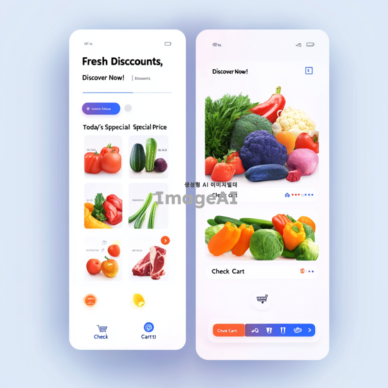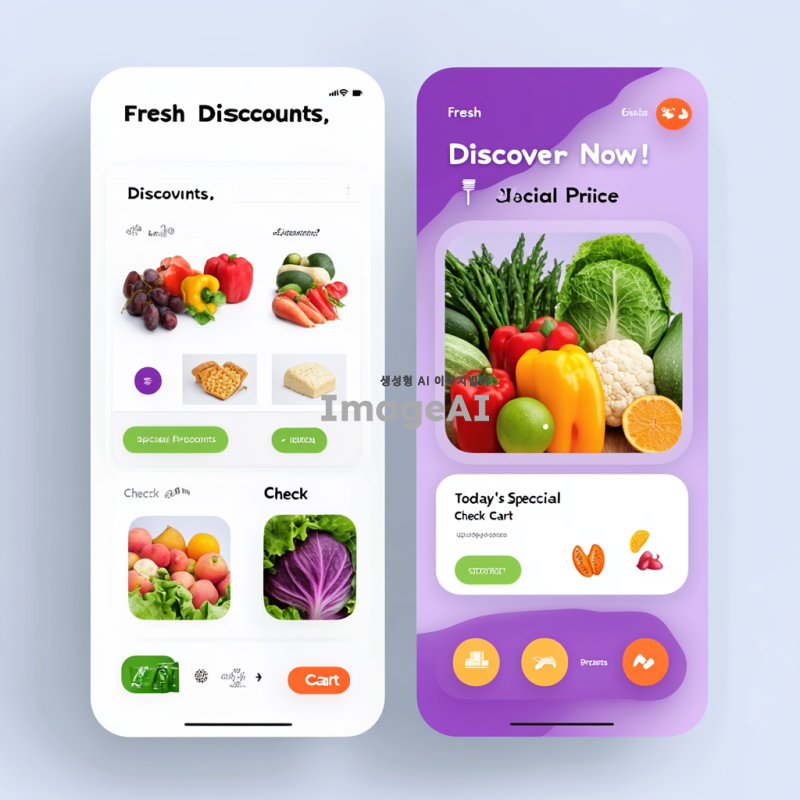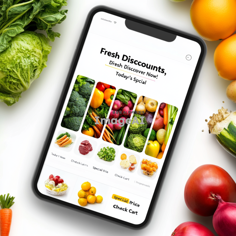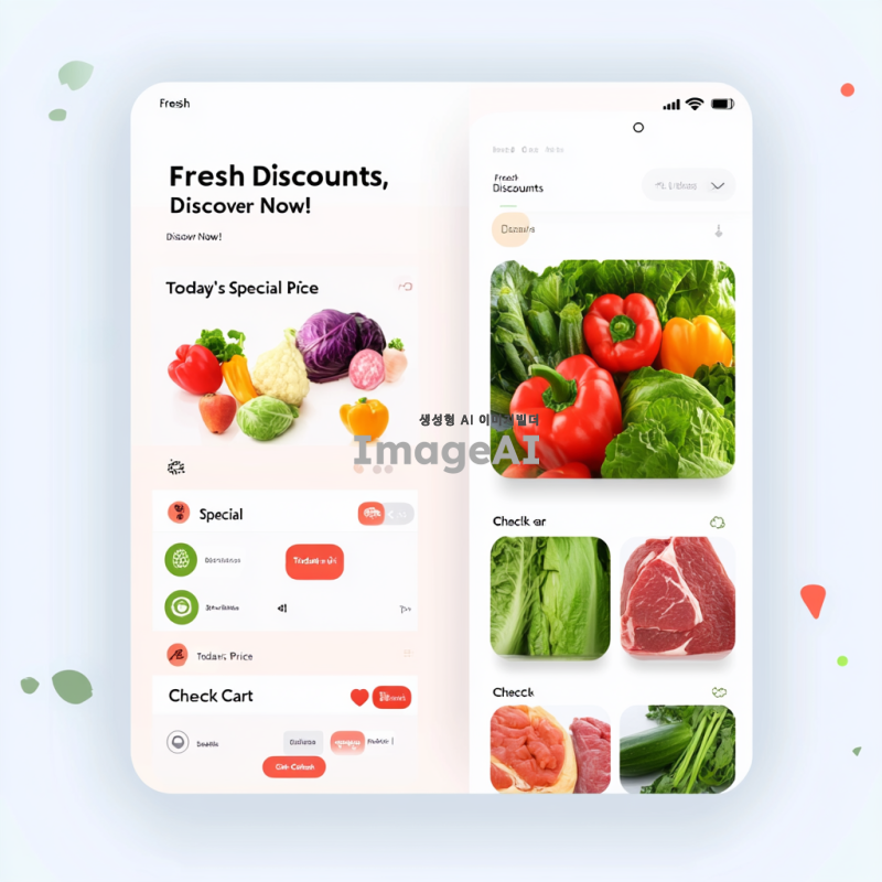 신선식품 할인 거래 어플리케이션의 첫 화면을 디자인합니다. 화면 중앙에는 다양한 신선식품이 진열된 카테고리 섹션이 있습니다. 상단에는 어플리케이션 로고와 함께 "신선한 할인, 지금 만나보세요!"라는 문구가 큼지막하게 적혀 있습니다. 카테고리에는 과일, 채소, 유제품, 육류 등이 아이콘 형태로 나열되어 있으며, 각각의 아이콘 아래에는 할인율이 표시되어 있습니다.