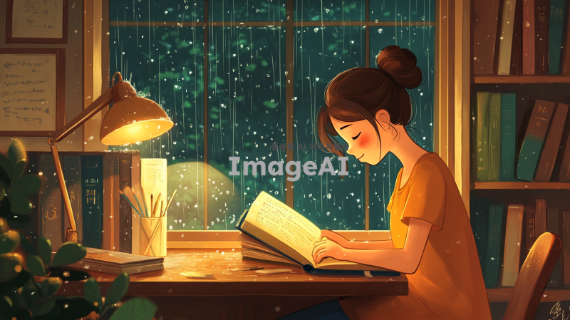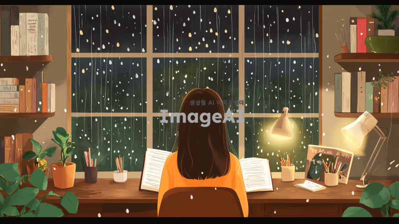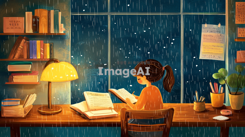 비 오는 밤, 책상에 앉아 공부하고 있는 한국 소녀의 모습. 따뜻한 조명이 비추는 방 안에서, 창밖으로 빗방울이 떨어지는 풍경이 보인다. 소녀는 집중하여 책을 읽고 있으며, 주변에는 학용품과 책들이 어지럽게 놓여 있다. 지브리 스타일의 부드럽고 감성적인 색감으로, 아늑한 분위기를 강조해 주세요.