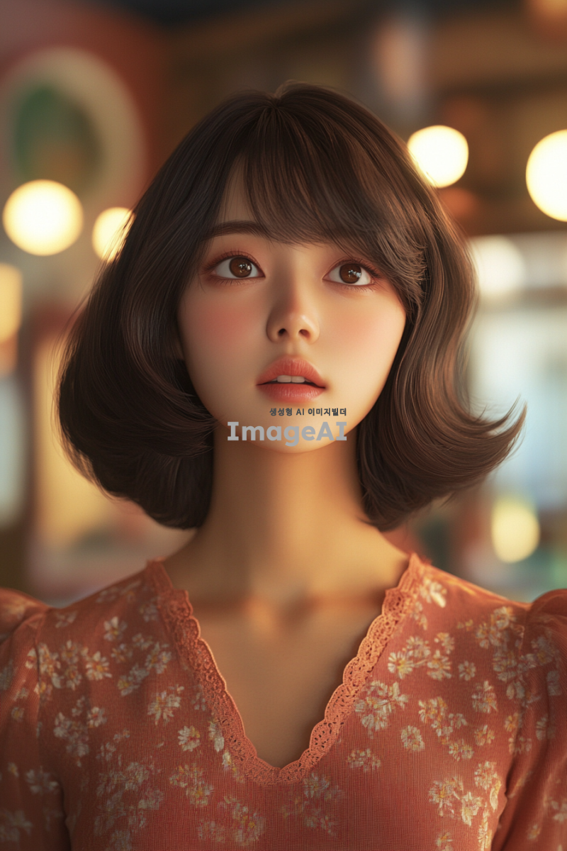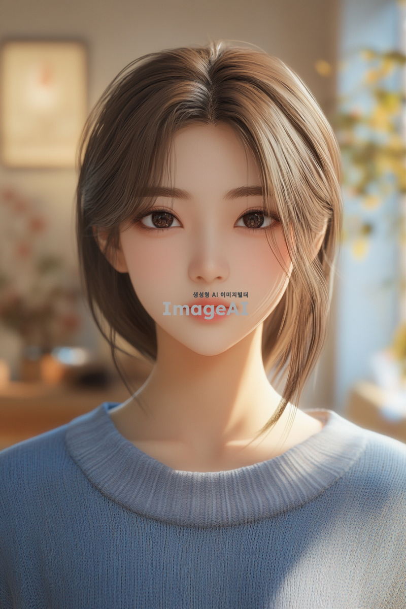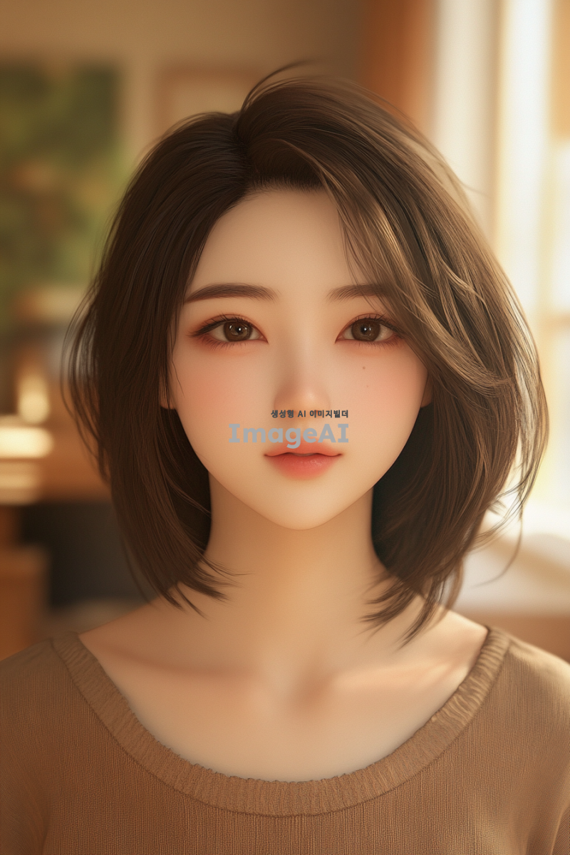 쇄골뼈 아래 길이의 매직 스타일 머리로, 부드러운 윤기가 흐르는 머리카락이 자연스럽게 떨어지는 모습. 한국인 여성의 얼굴을 가진 인물로, 편안한 표정과 함께 정면을 바라보고 있는 모습. 배경은 부드러운 색조의 실내 공간으로 설정하여 아늑한 분위기를 연출.
