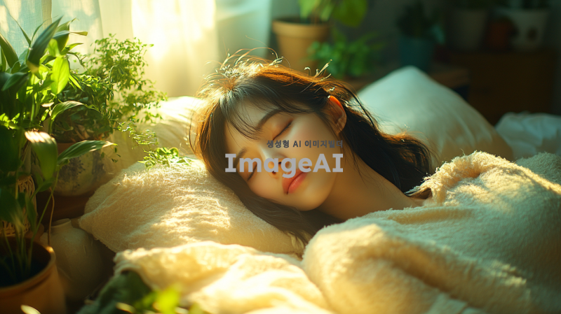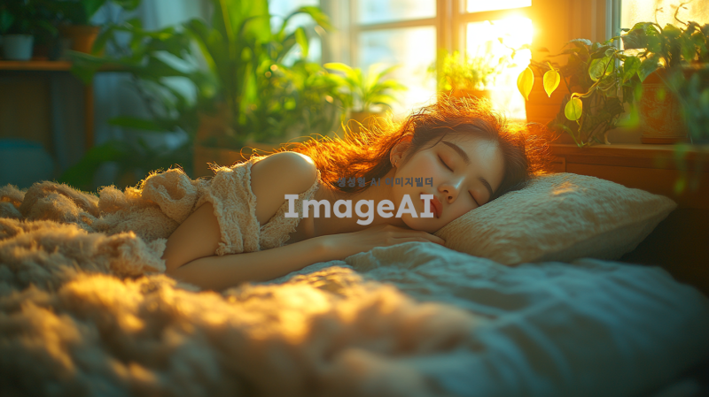 아름다운 방 안에서 편안하게 자고 있는 한국 여성의 모습. 방은 아늑하고 세련된 인테리어로 꾸며져 있으며, 부드러운 조명이 방을 따뜻하게 비추고 있다. 침대는 푹신한 이불과 베개로 아늑하게 꾸며져 있고, 창문 너머로 부드러운 햇살이 들어오고 있다. 방 안에는 식물과 아기자기한 소품들이 놓여 있어 편안한 분위기를 연출하고 있다.