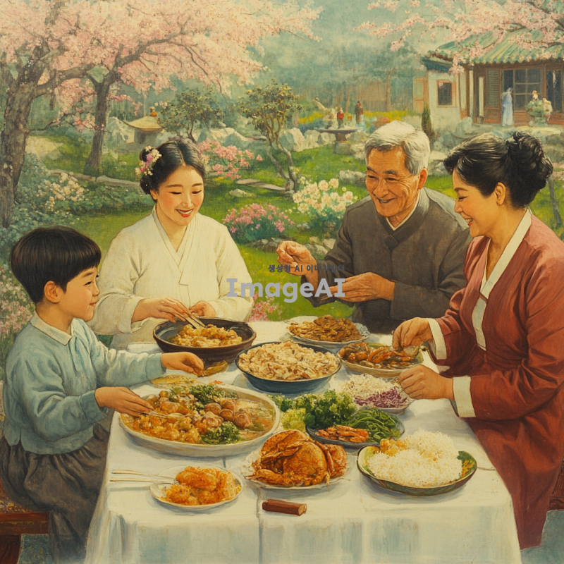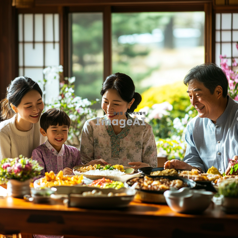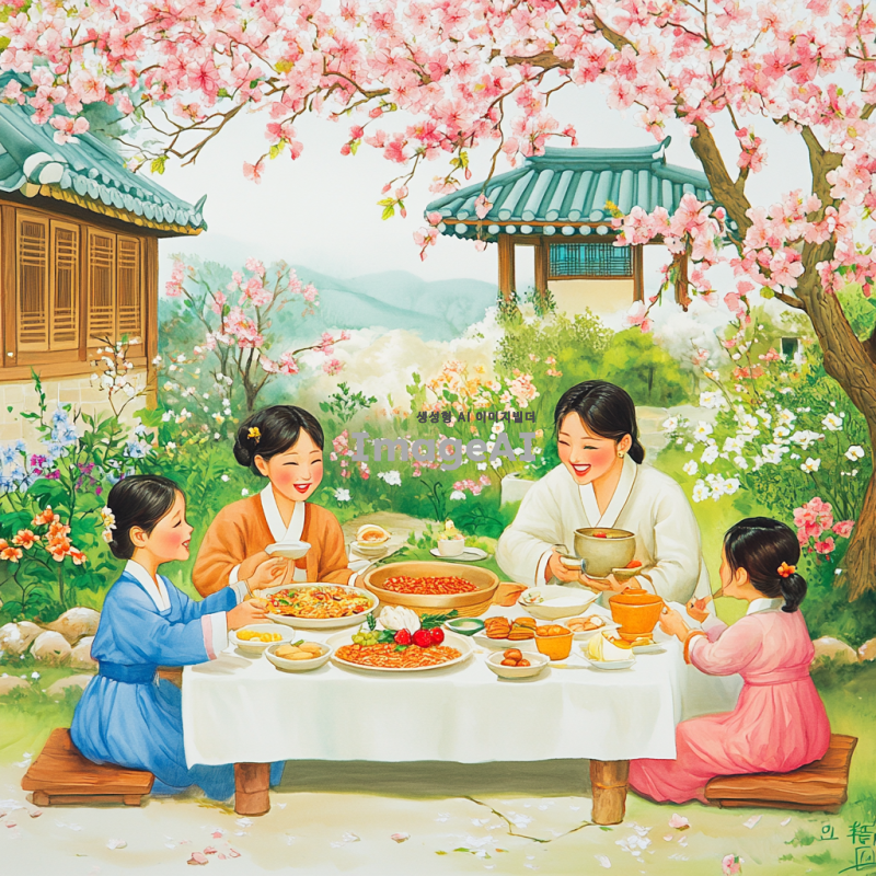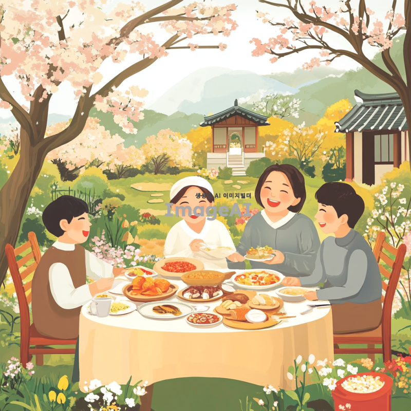 유월절을 기념하는 전통적인 장면, 한국의 가족이 함께 모여 유월절 음식을 준비하는 모습, 화려한 색상의 식탁, 전통적인 유월절 음식들이 놓여 있는 풍경, 따뜻한 조명 아래에서 웃고 있는 가족의 모습, 배경에는 봄꽃이 만발한 정원, 평화롭고 행복한 분위기.