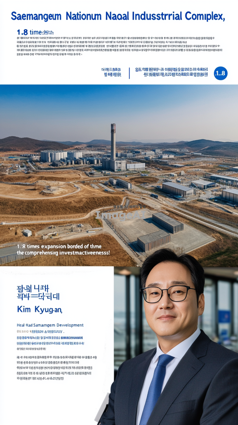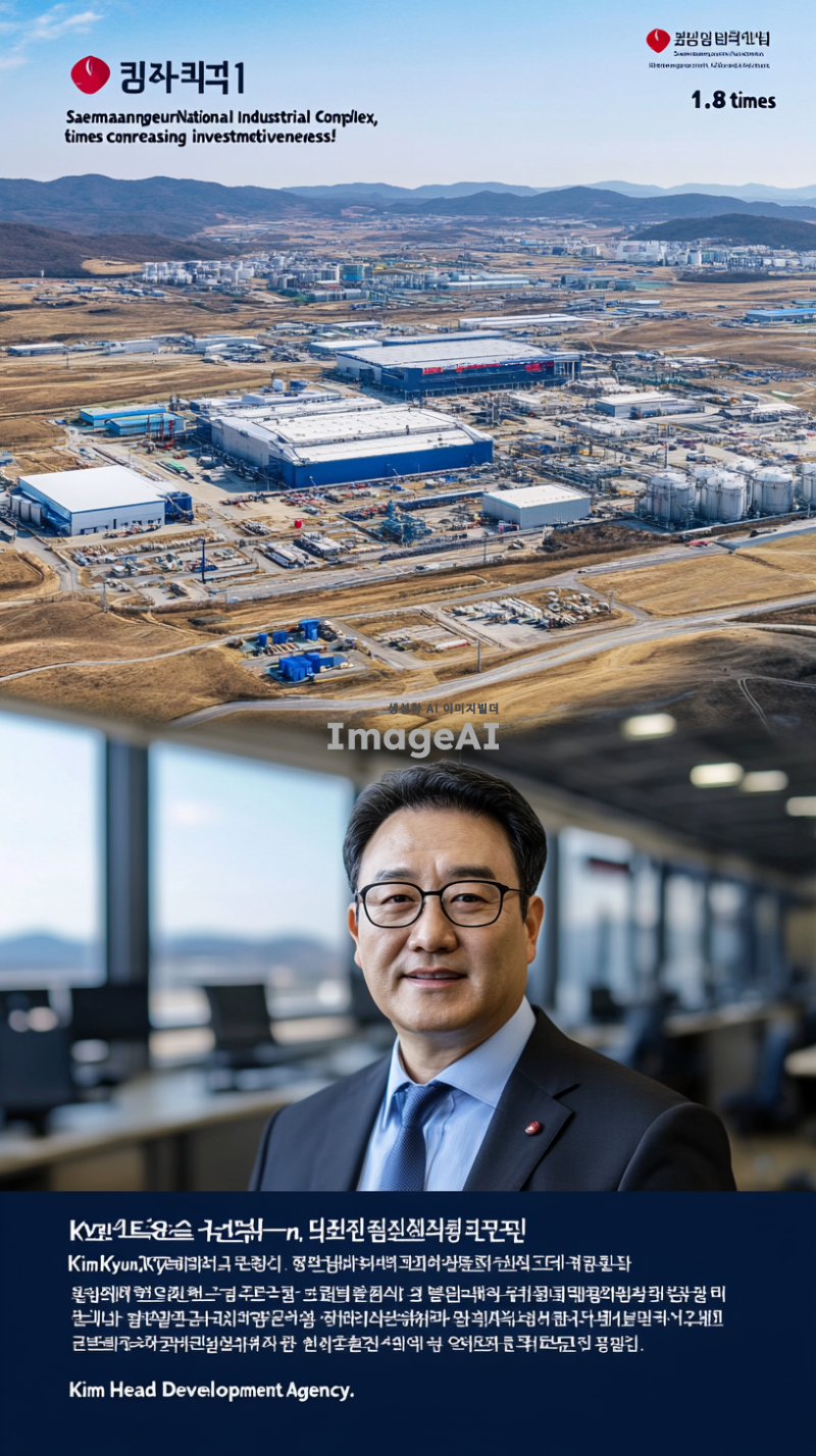 새만금개발청 로고와 함께 "새만금 국가산단, 종합보세구역 1.8배 확대로 투자 매력도 UP!"라는 자막이 나타나는 장면. 새만금 국가산단의 넓은 전경을 드론으로 촬영한 이미지, 푸른 하늘과 넓은 땅이 조화를 이루는 풍경. 새만금개발청 김경안 청장의 사진과 함께 "김경안 새만금개발청장"이라는 자막이 나타나는 장면. 청장의 표정은 진지하고 미래 지향적인 느낌을 주며, 배경은 현대적인 사무실 환경.