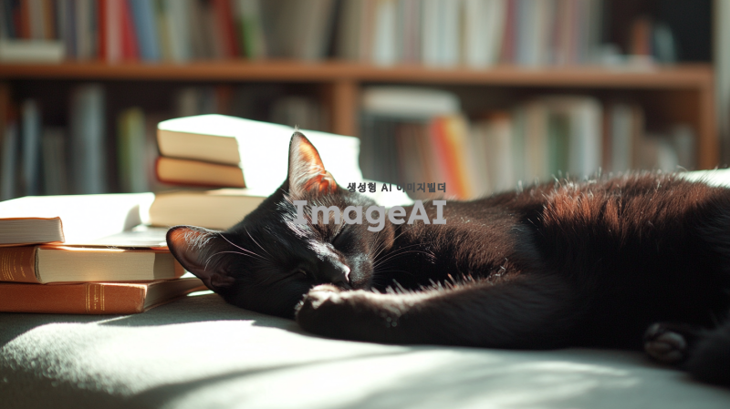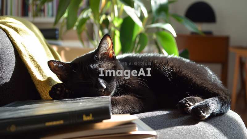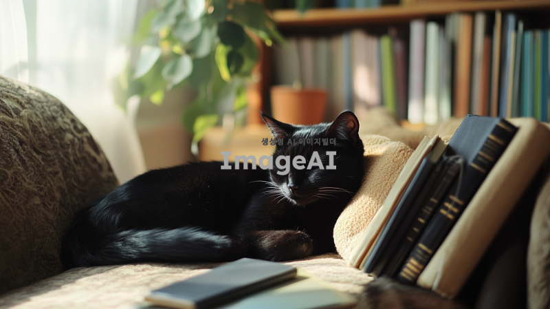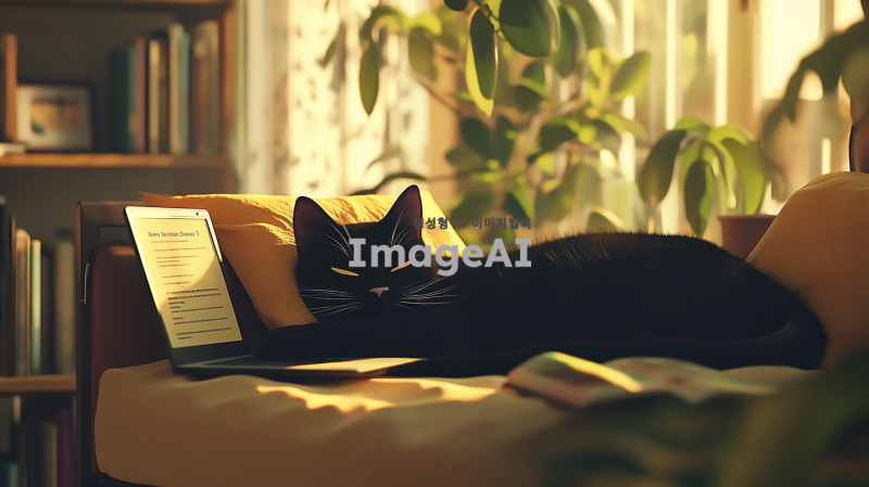 일하기 싫어하는 검정 고양이가 소파에 누워 있는 모습, 귀여운 표정으로 졸고 있는 모습, 주변에는 책과 노트북이 흩어져 있고, 햇살이 창문을 통해 들어오는 따뜻한 분위기, 편안한 집안의 정경, 고양이의 털이 부드럽고 윤기 나는 모습.