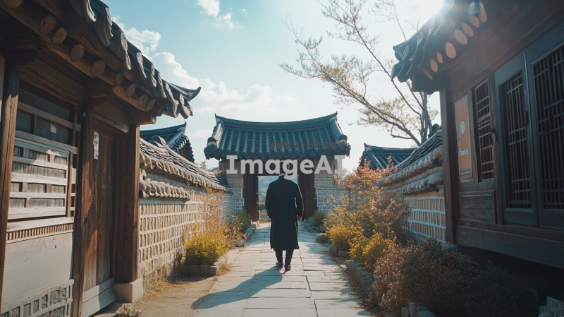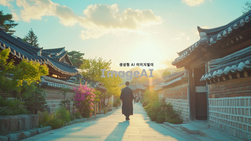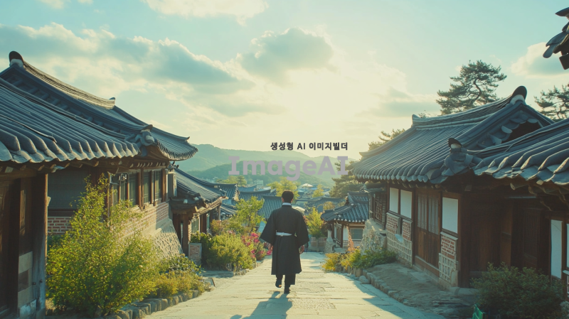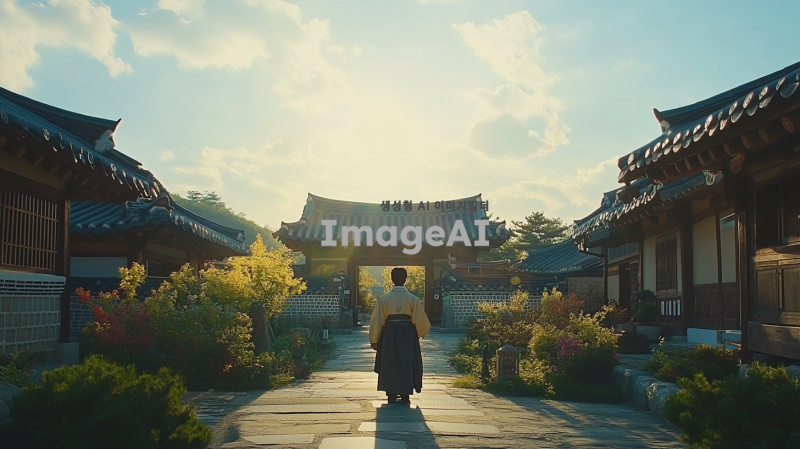 한국의 전통 마을 입구에서 한 남성이 걸어 들어오는 장면, 푸른 하늘 아래 햇살이 비추고, 주변에는 전통 가옥과 아름다운 정원이 펼쳐져 있는 모습, 남성은 한복을 입고 있으며, 평화롭고 따뜻한 분위기를 전달하는 장면.