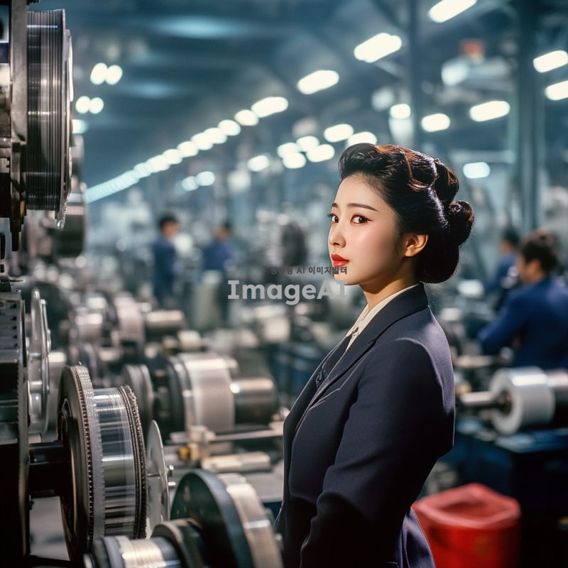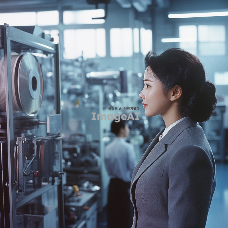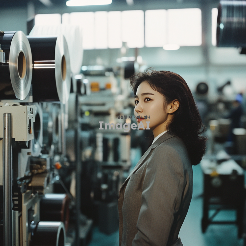 PPF 필름 생산 공장에서 필름을 생산하는 장면. 공장 내부는 현대적이고 깔끔하며, 자동화된 기계들이 작동하고 있는 모습. 필름이 생산되는 과정이 잘 보이도록 디테일하게 표현. 그 앞에 정장을 입고 있는 20대 한국인 여성, 자신감 있는 표정으로 공장을 바라보며 서 있는 모습. 배경에는 다양한 필름 롤과 작업자들이 바쁘게 움직이는 모습이 포함되어 있음.