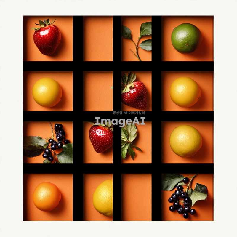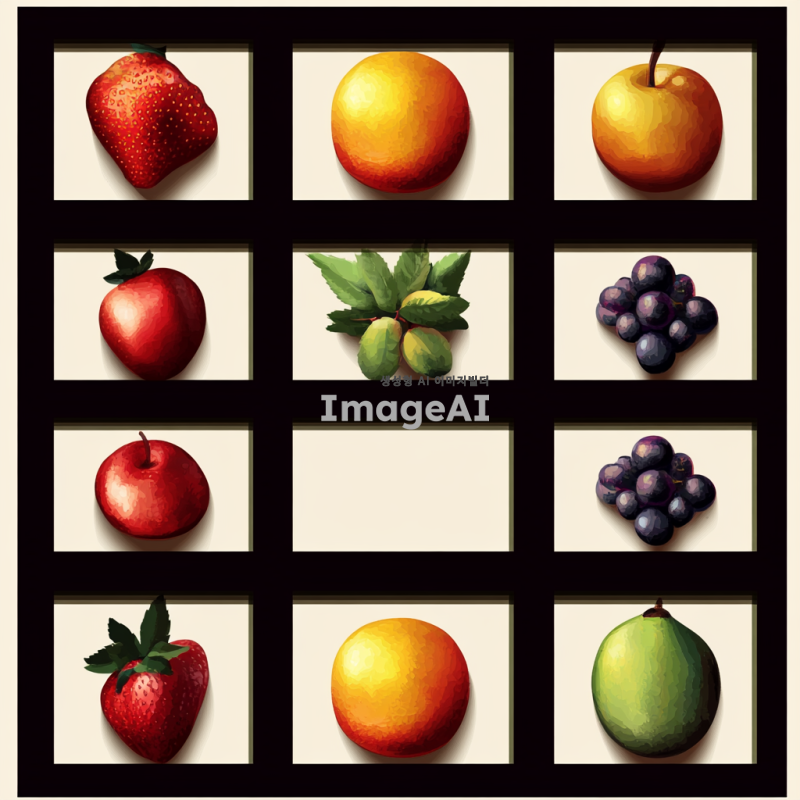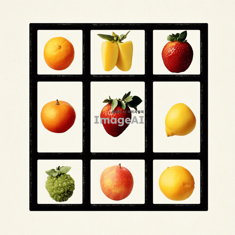 이탈리아 양식의 고급스러운 로고 디자인, 9개의 분할된 공간이 있는 과일 선물박스 형태, 세련된 색상 조합과 우아한 폰트 사용, 과일의 생동감 있는 이미지와 함께 고급스러운 느낌을 강조, 배경은 부드러운 텍스처로 처리, 전체적으로 고급스러움과 품격을 느낄 수 있는 디자인.