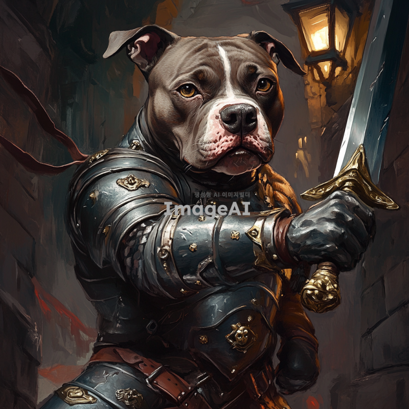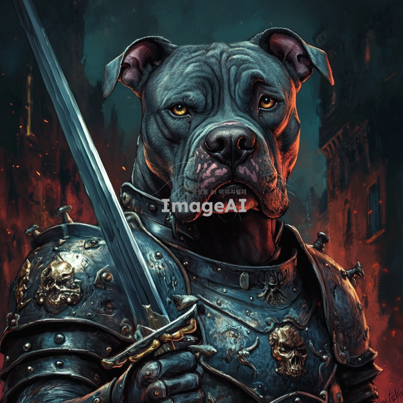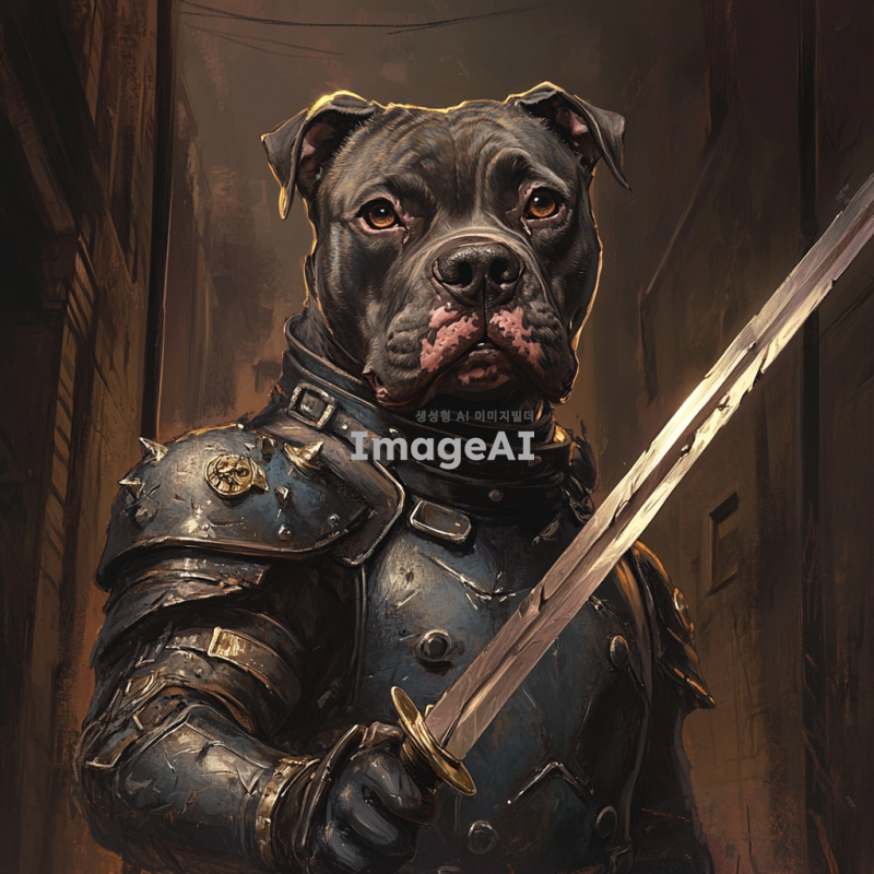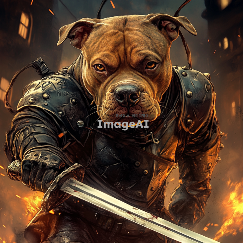 화난 핏불 테리어가 갑옷을 입고 칼을 들고 있는 모습, 강렬한 표정과 함께 전투 준비 자세를 취하고 있는 모습, 배경은 어두운 도시 환경, 긴장감 넘치는 분위기, 세밀한 디테일과 생동감 있는 색감