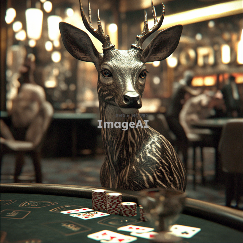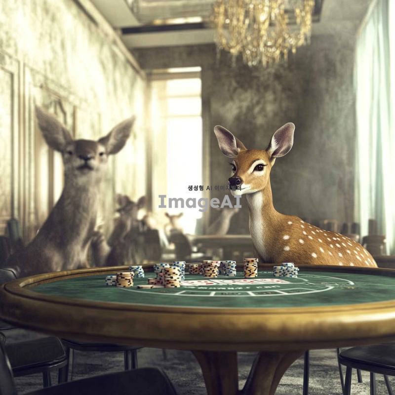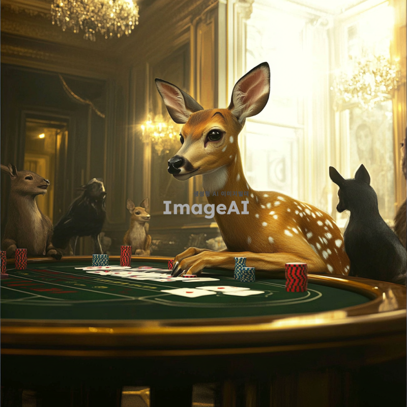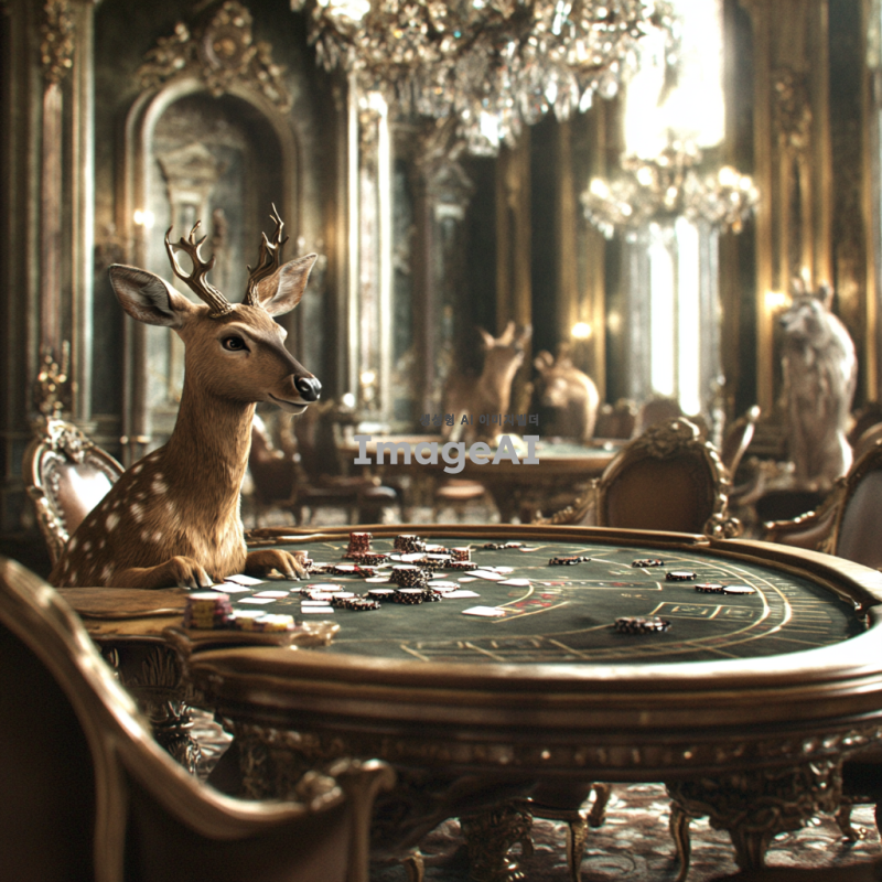 고라니가 테이블에 앉아 포커 홀덤을 치고 있는 모습, 긴 귀와 날렵한 몸매를 가진 고라니가 집중하는 표정, 카드와 칩이 놓인 테이블 위에서 전략을 세우는 장면, 주변에는 다른 동물들이 관전하고 있는 모습, 조명이 어두운 카지노 분위기, 고급스러운 인테리어와 함께 신비로운 느낌을 강조하여 그려줘.