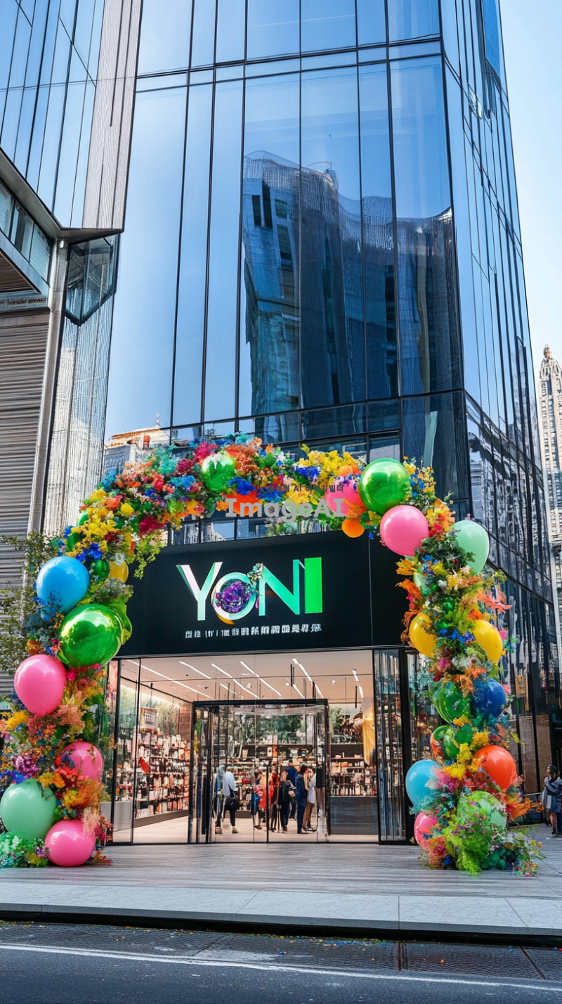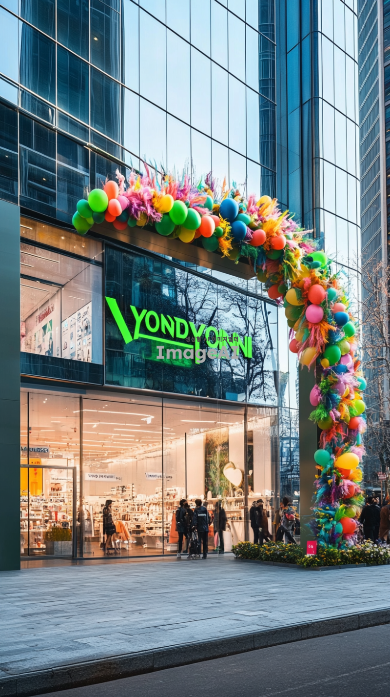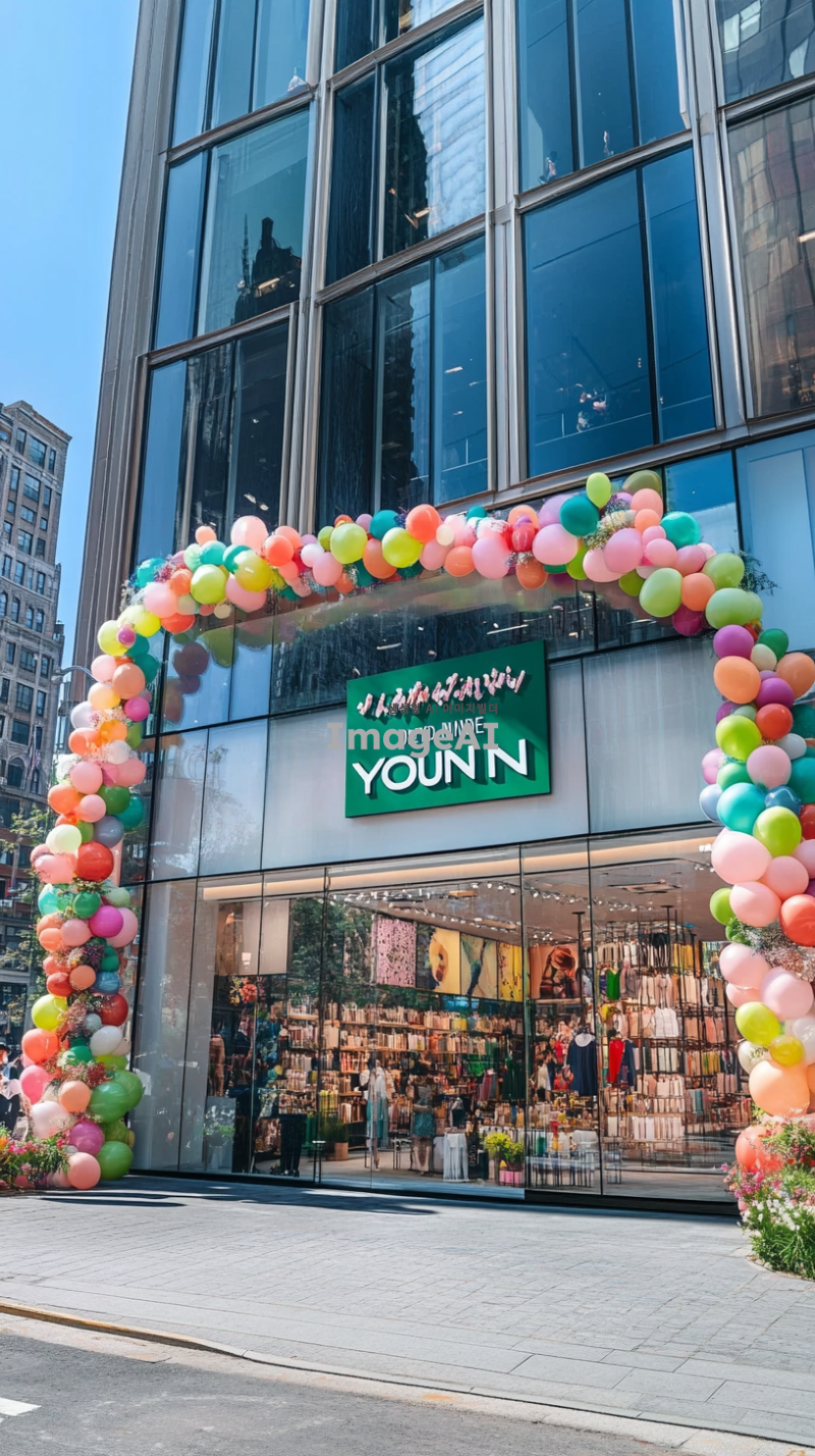 장면 설명: 한복판에 위치한 뉴욕의 올리브영 N 매장 외부. 매장 앞에는 화려한 리본과 풍선으로 장식된 아치가 세워져 있고, 다양한 색상의 꽃들이 장식되어 있다. 매장 유리창을 통해 내부의 다양한 제품들이 빛을 받으며 반짝이고 있다.